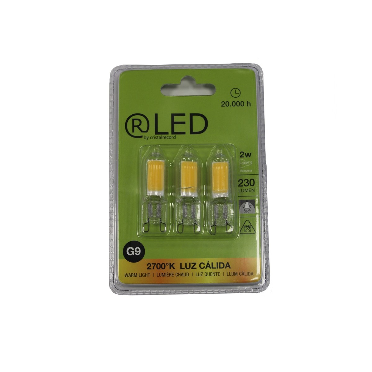 blister 3 ampoules LED en verre G9 à 2w, avec une lumière chaude de 3000K, 250lm.