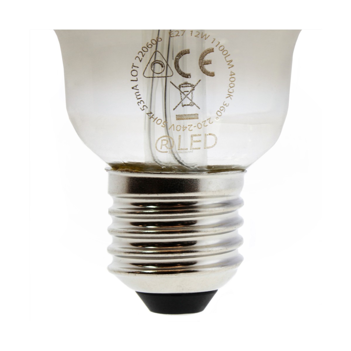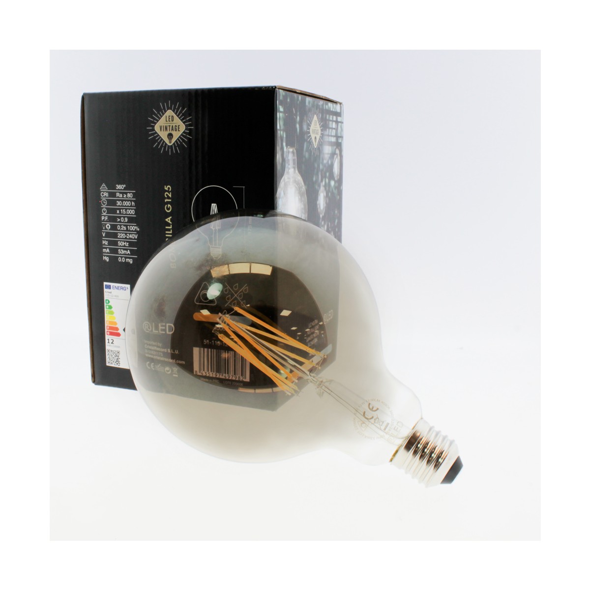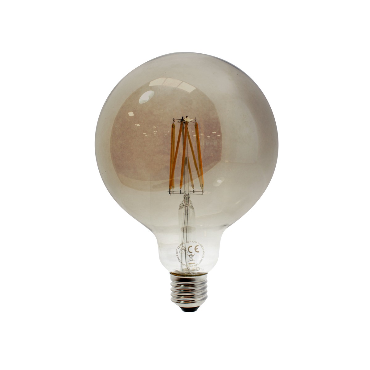 Ampoule décorative à filament fumé. Filetage E27 et globe G125 en verre fumé. Eclairage LED de 12W, 1100 lumens d'intensité et couleur blanc neutre (4000K).
