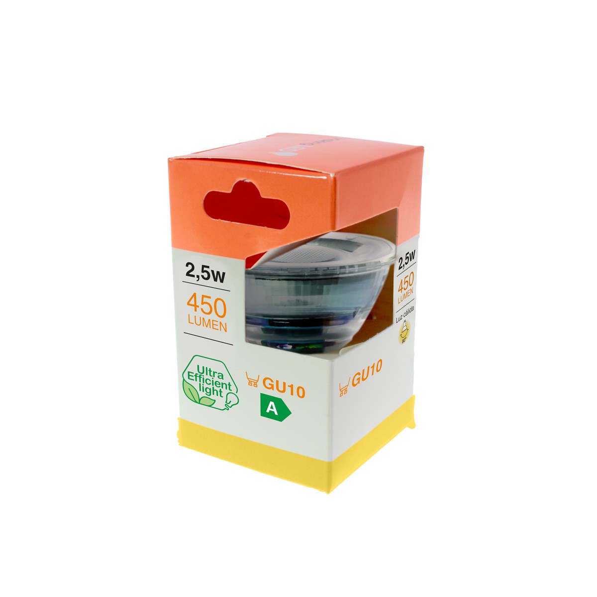 Ampoule LED GU10 en verre avec température de couleur blanc chaud. Éclairage LED de 2,5 W, 450 lumens et température de couleur blanc chaud (3000 K). Éclairage ultra efficace avec une efficacité énergétique de classe A. Faisceau lumineux de 80º, durée de vie de 35 000 heures et allumage en 0,5 seconde. Diamètre de 50 mm.