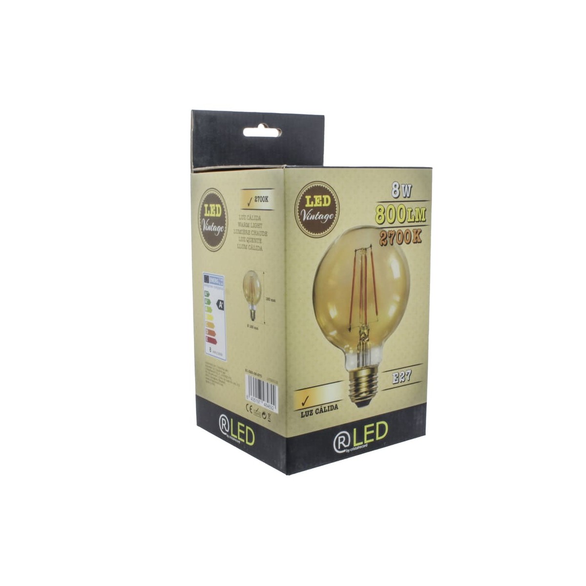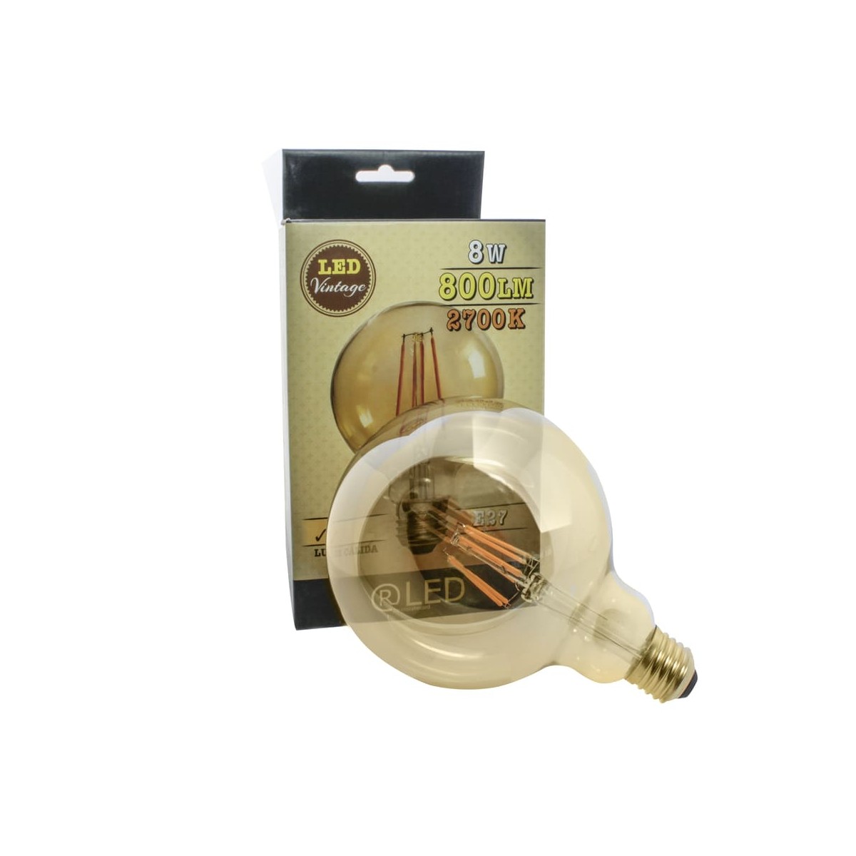 Ampoule décorative avec filament LED en verre de couleur caramel. Il fournit à la pièce une agréable lumière jaune chaude de 2700K, avec une puissance de 8W et un rendement lumineux de 100lm/W
