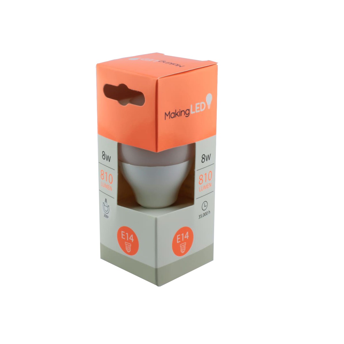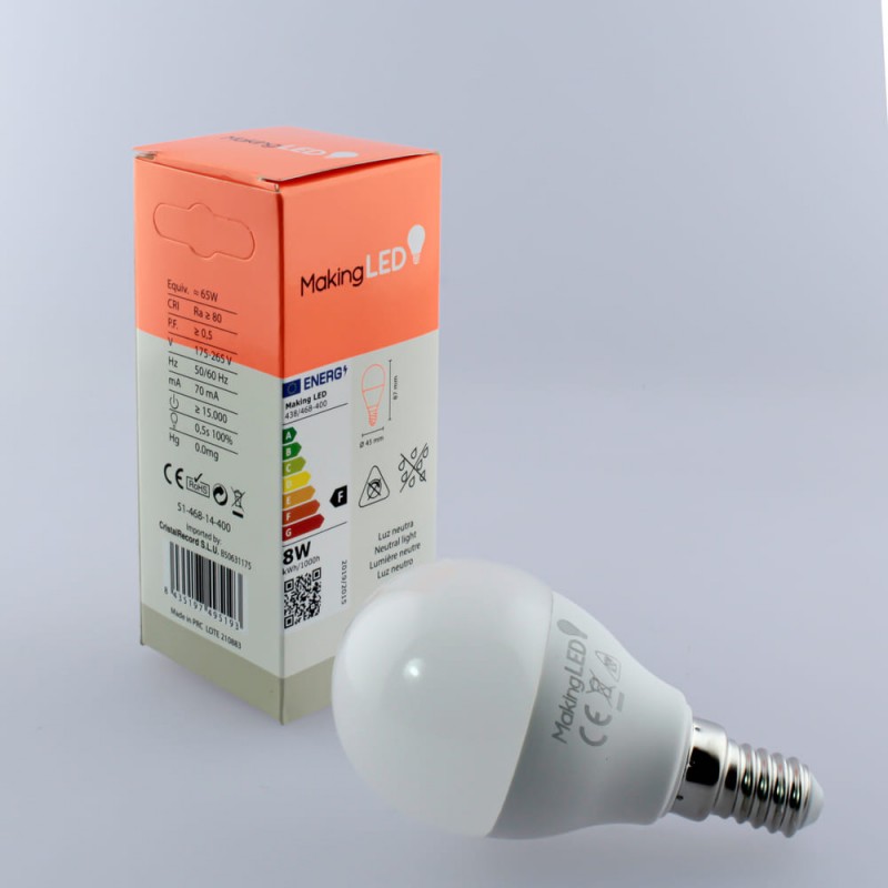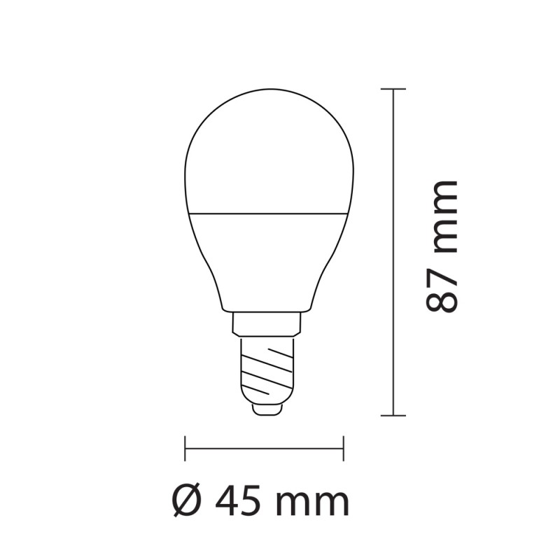 Ampoule avec culot E14, sphérique de 45mm, en PVC avec diffuseur blanc mat.