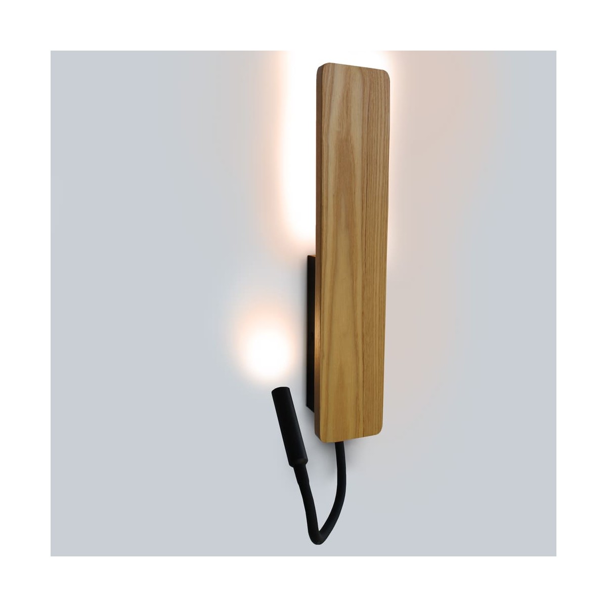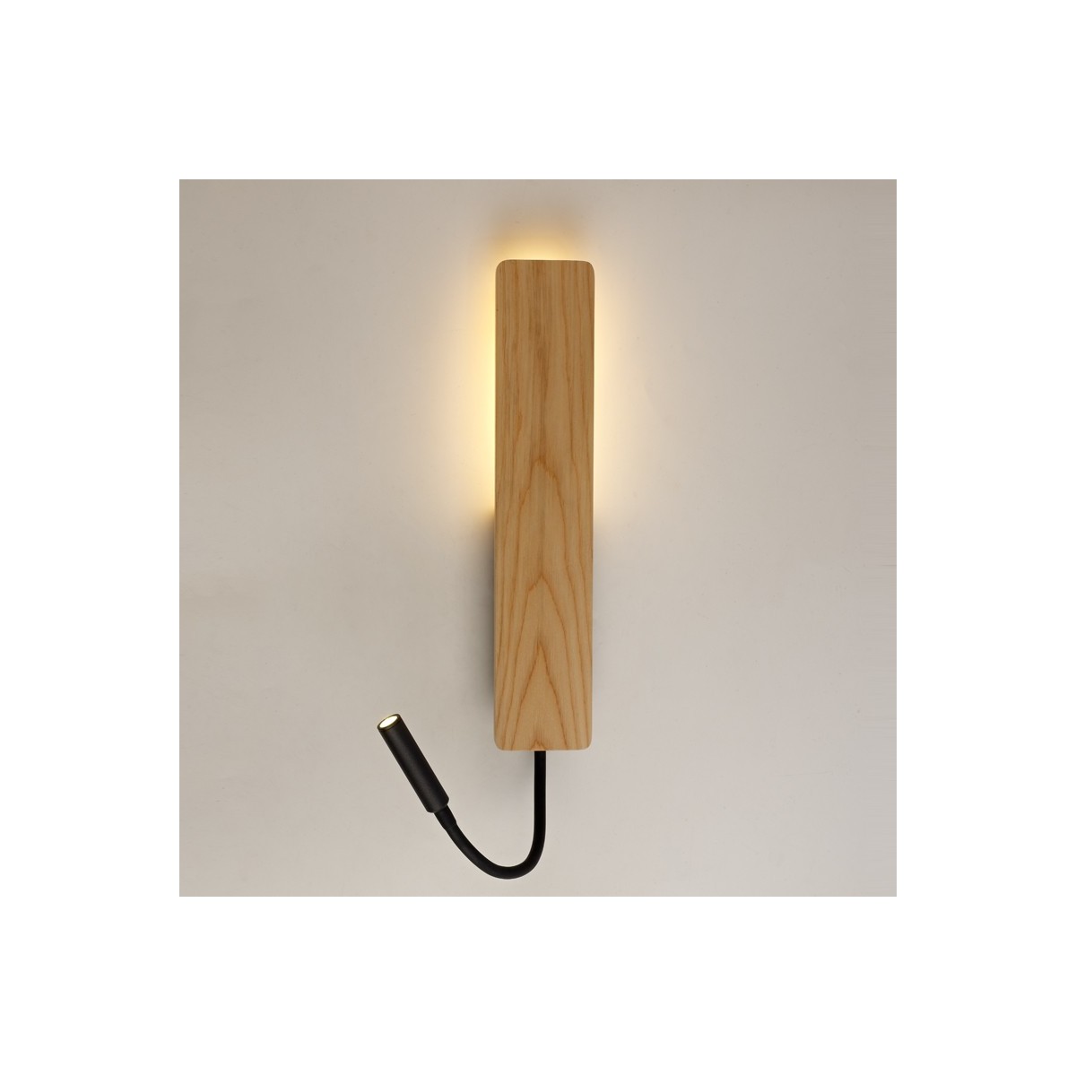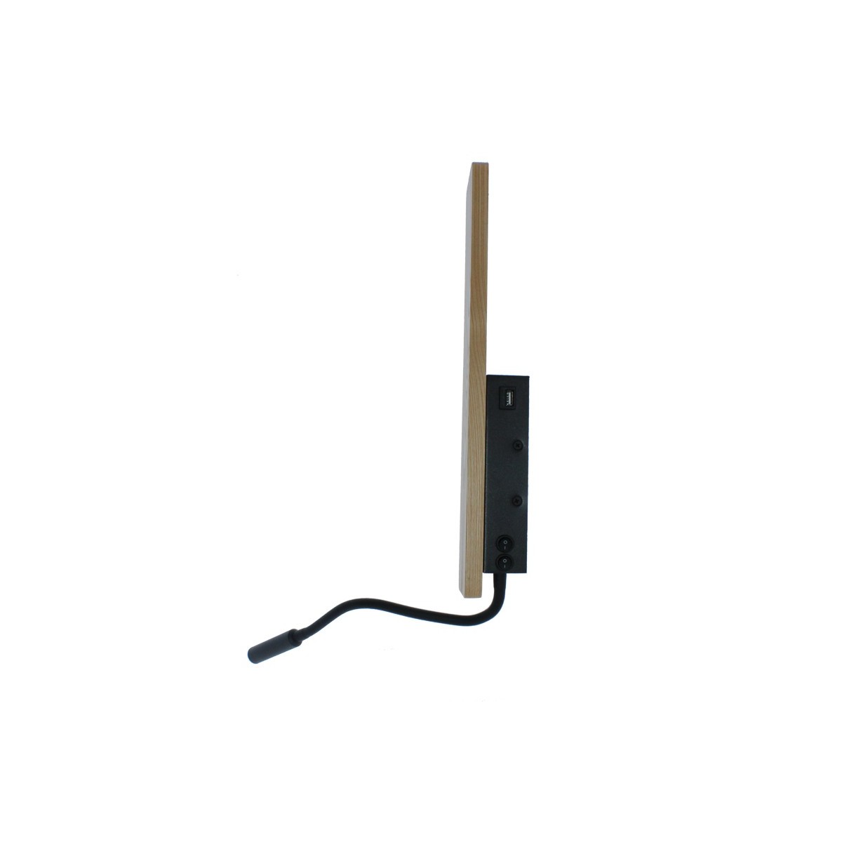 Applique murale avec double éclairage Led 5W+3W à lumière chaude (3000K) L'éclairage Led du projecteur a une puissance de 3W, le dos du bois décoratif a une bande Led de 5W. Il dispose d'un interrupteur pour chaque lampe et d'un port USB très pratique. Le bras de la lumière auxiliaire est complètement flexible, ce qui permet d'orienter l'éclairage.