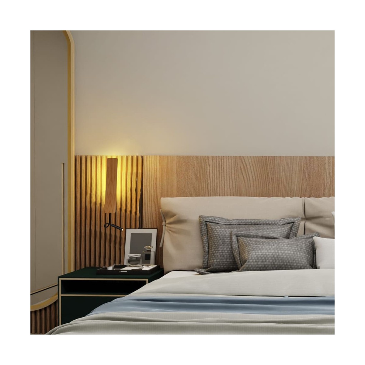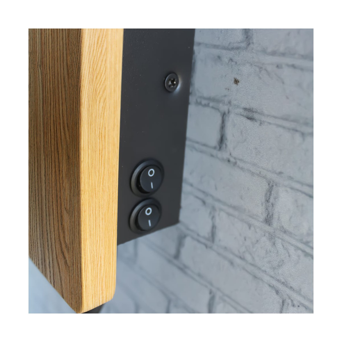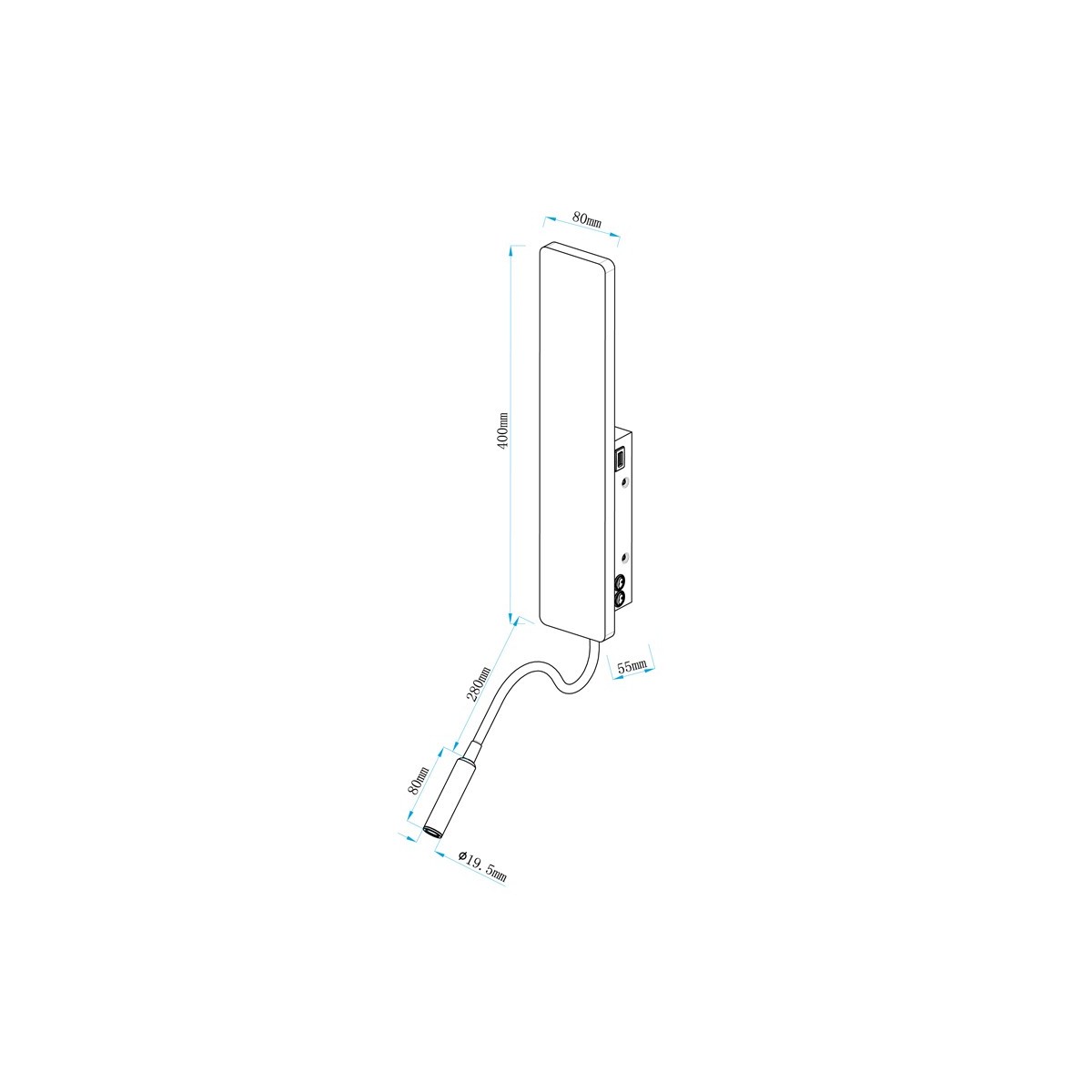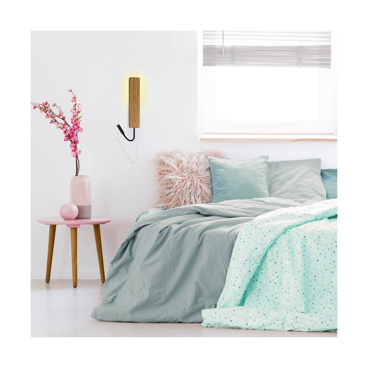 Applique murale avec double éclairage Led 5W+3W à lumière chaude (3000K) L'éclairage Led du projecteur a une puissance de 3W, le dos du bois décoratif a une bande Led de 5W. Il dispose d'un interrupteur pour chaque lampe et d'un port USB très pratique. Le bras de la lumière auxiliaire est complètement flexible, ce qui permet d'orienter l'éclairage.