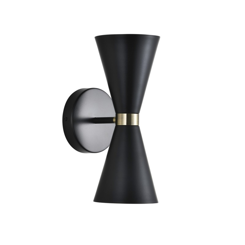 Applique murale à deux points lumineux. Applique très pratique pour éclairer un hall ou un passage. Deux formes coniques en noir avec une petite pièce métallique comme touche d'union et de décoration. La lumière est projetée vers le haut et vers le bas, créant un éclairage ambiant optimal.