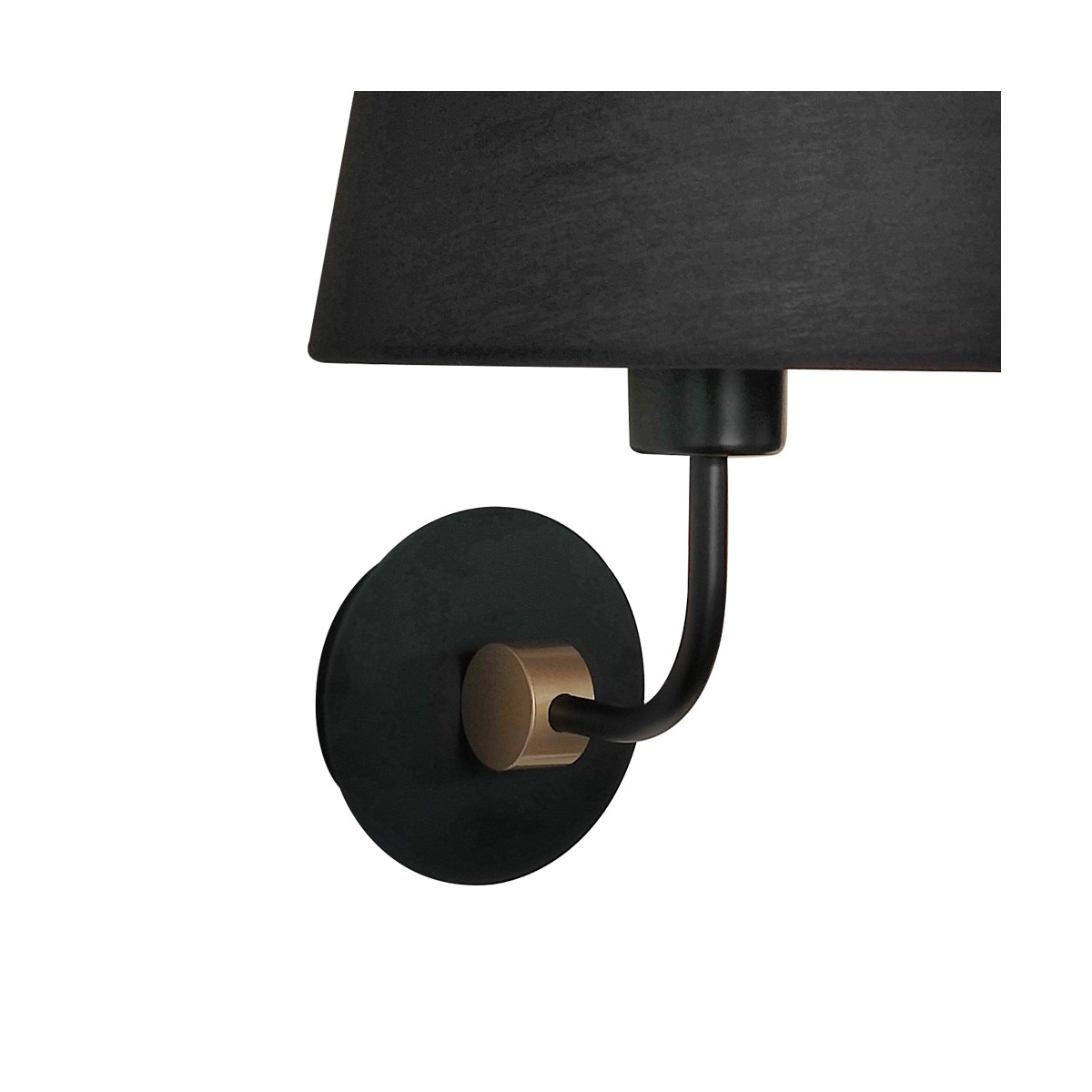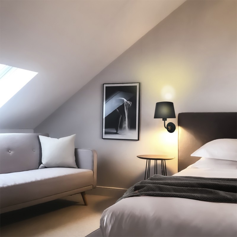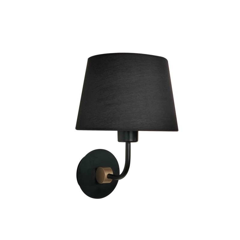 Applique murale pour les entrées, les couloirs et les chambres. Design minimaliste avec base en métal et abat-jour en tissu noir. La base est ornée d'un petit détail doré. Vous pouvez installer une applique de chaque côté du lit pour l'éclairer.