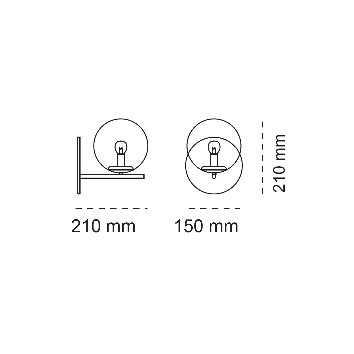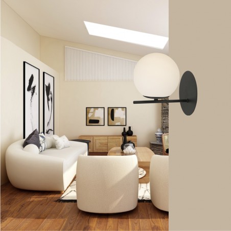 Applique murale avec abat-jour sphérique en verre opale. Applique très pratique à installer dans une entrée, un couloir ou à côté de la tête de lit. Structure en métal noir et abat-jour en verre opale en forme de sphère. L'abat-jour est éclairé de manière uniforme, ce qui permet d'obtenir un éclairage doux. 1xE14.