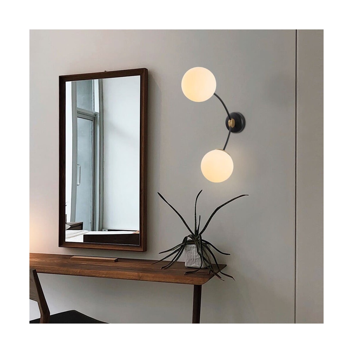 Applique de murale avec bras en métal noir avec deux lumières et des abat-jour en verre blanc dépoli. La lampe mesure 51 cm de haut. Il fonctionne avec des ampoules E27, non incluses.