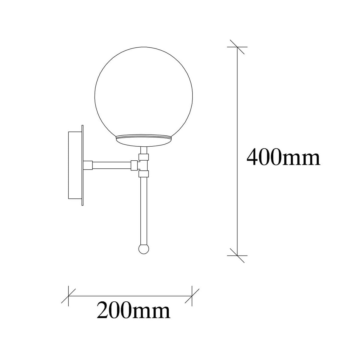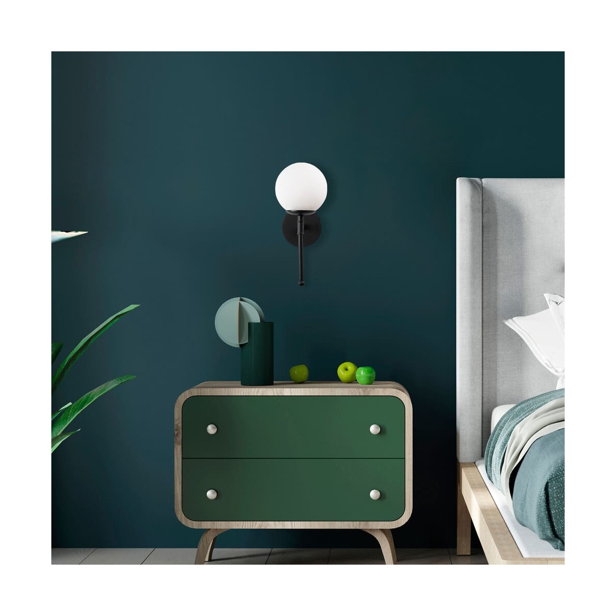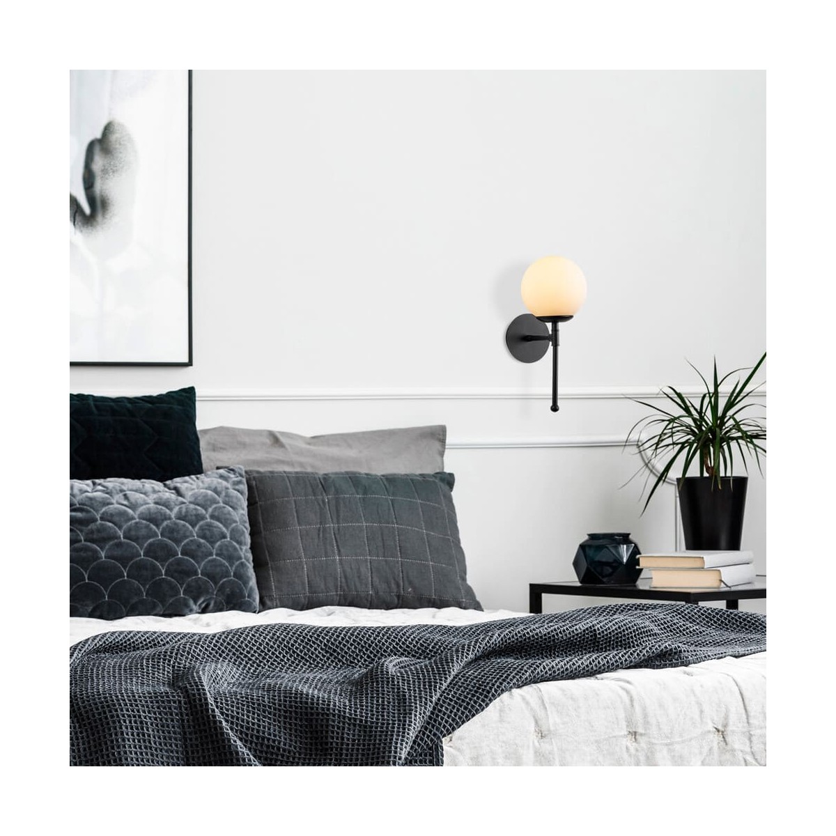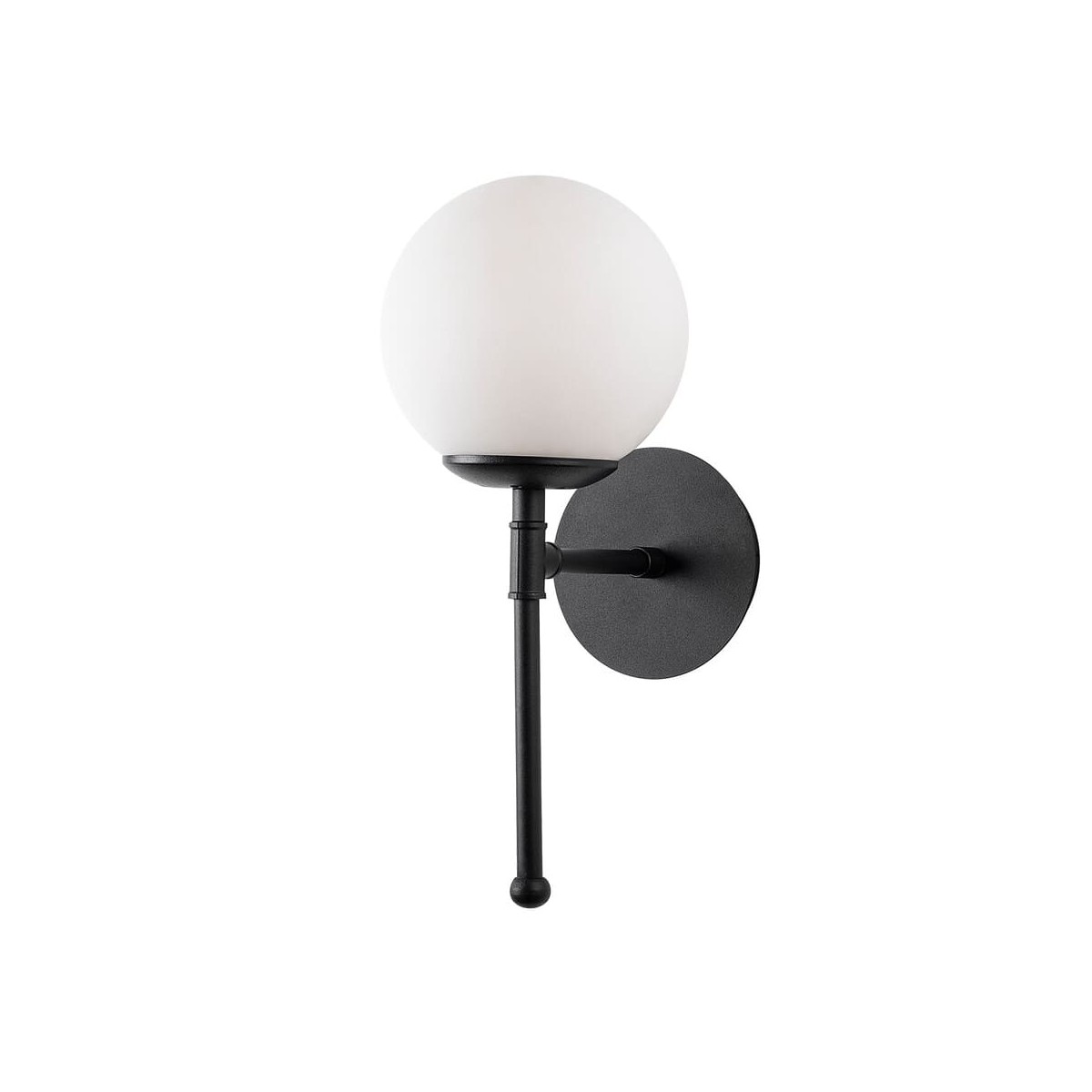 Applique métallique avec finition noir. Applique décorative à une lumière, pour ampoule E27, avec abat-jour en verre blanc mat.