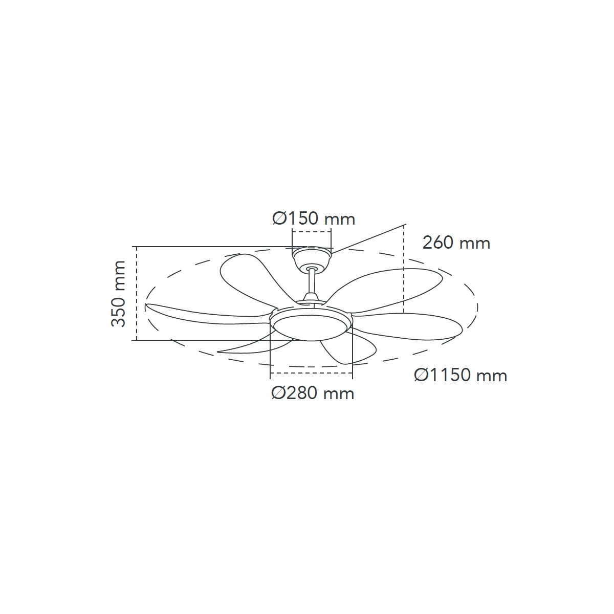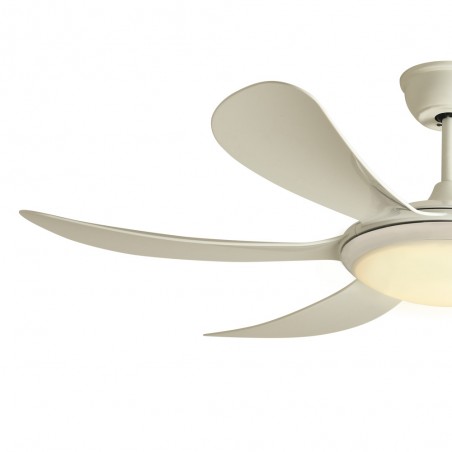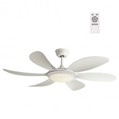 Ventilateur de plafond avec éclairage Led intégré à trois températures (3500K-6000K) Avec son moteur DC silencieux, il fonctionne avec 5 vitesses différentes et comprend une minuterie de 1h, 4h et 8h et une fonction été-hiver. Il conserve la mémoire de l'incendie. Comprend la télécommande.