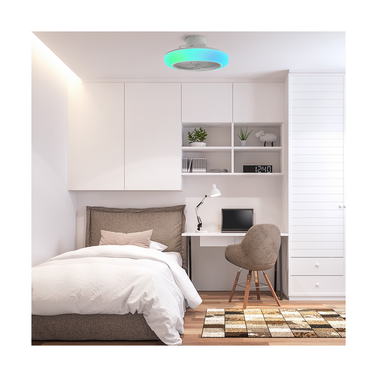Ventilateur de plafond avec haut-parleur et éclairage LED RVB. Ventilateur de plafond moderne en forme de plafonnier pour l'éclairage d'une chambre de jeunes. Vous pouvez contrôler la température de couleur, l'intensité lumineuse et régler les couleurs RVB. Les pales sont intégrées dans le ventilateur à l'intérieur d'une grille. Il dispose d'un haut-parleur avec connexion bluetooth pour diffuser votre musique préférée.