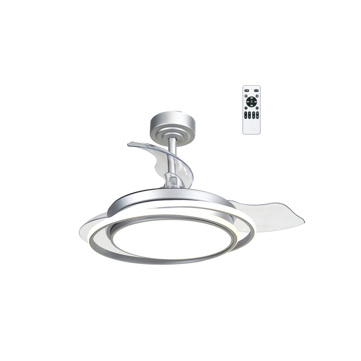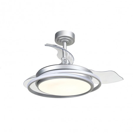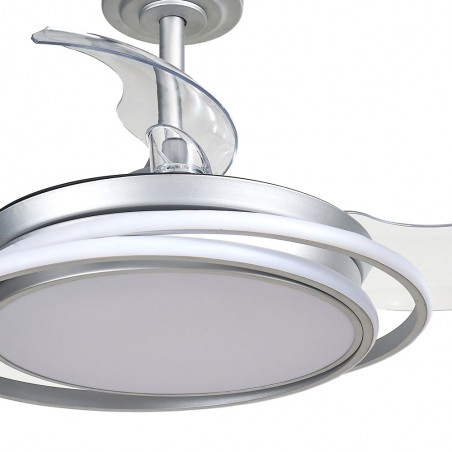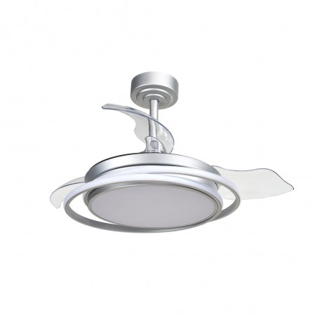 Ventilateur de plafond à LED Antila Mini en argent. Ventilateur avec moteur DC ultra-silencieux avec six vitesses de rotation, fonction inversée hiver été et brise. Sa conception avec des pales rétractables signifie que lorsque le ventilateur ne fonctionne pas, les pales sont rétractées sur le dessus du ventilateur. Ce type de ventilateur est très pratique pour éclairer une chambre à coucher ou un petit salon. Vous pouvez contrôler la lumière individuellement, en allumant seulement la lumière principale, seulement l'anneau décoratif ou tout le ventilateur en même temps que vous en avez besoin. Éclairage LED à gradation avec trois tons de température de couleur.
