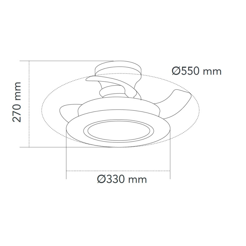 Ventilateur de plafond à LED avec pales rétractables Villa. Ventilateur de plafond avec moteur à courant continu silencieux à 6 vitesses de rotation, fonction inverse et minuterie. Son design, avec un diamètre de 33 centimètres et des pales rétractables, le rend idéal pour les chambres à coucher. Il dispose de différentes températures de couleur de lumière. Télécommande incluse.