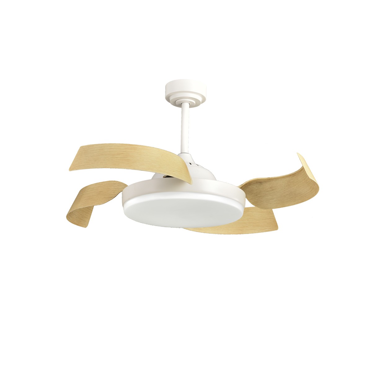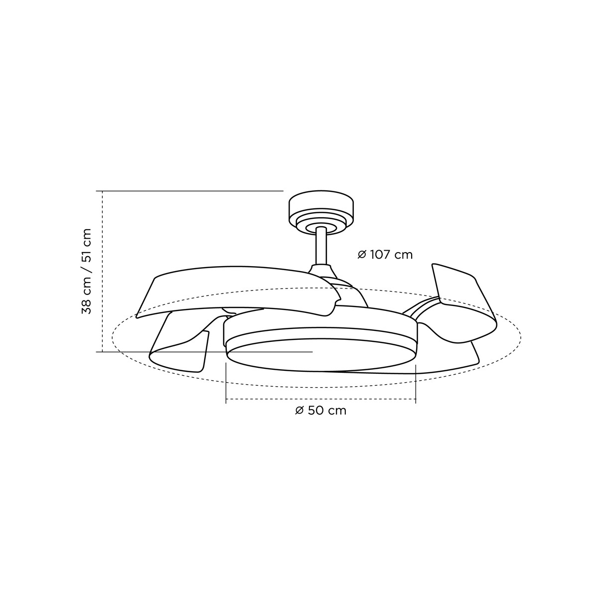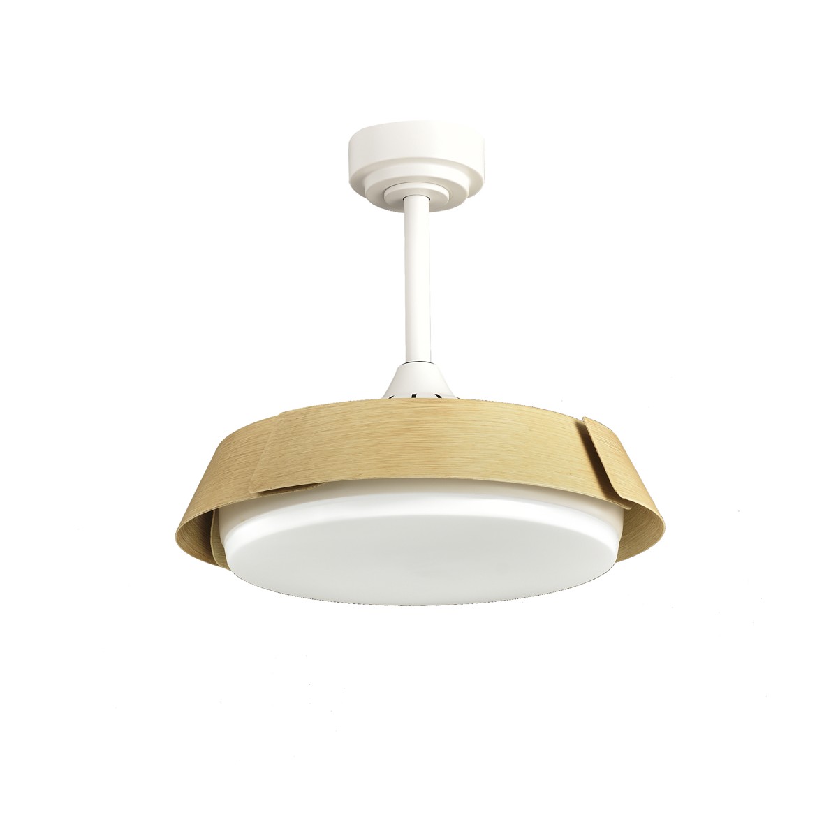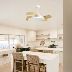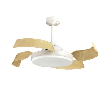 Ventilateur de plafond à LED Batán pour les salles de séjour modernes. Ventilateur blanc avec des pales couleur bois conçu pour être installé dans les salons et les salles à manger de taille moyenne. Les pales sont rétractées et ne se déploient que lorsque le ventilateur est en marche. Avec un moteur à courant continu à six vitesses, le ventilateur émet un minimum de bruit lorsqu'il assure la circulation de l'air dans la pièce. Vous pouvez faire varier l'intensité lumineuse et choisir parmi trois températures de couleur pour créer un éclairage parfait à chaque fois.