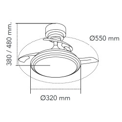 Ventilateur de plafond Antila Mini XS LED en blanc. Ventilateur avec moteur DC ultra-silencieux avec six vitesses de rotation, fonction inversée hiver été et brise. Sa conception avec pales rétractables signifie que lorsque le ventilateur n'est pas en fonctionnement, les pales sont rétractées sur le dessus du ventilateur. Ce type de ventilateur est très pratique pour éclairer une petite chambre grâce à sa taille compacte et à ses pales rétractables. La télécommande permet d'allumer simultanément l'éclairage principal, l'anneau décoratif ou l'ensemble du ventilateur. L'éclairage LED est graduable et offre trois niveaux de température de couleur.