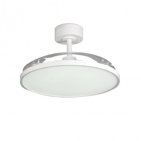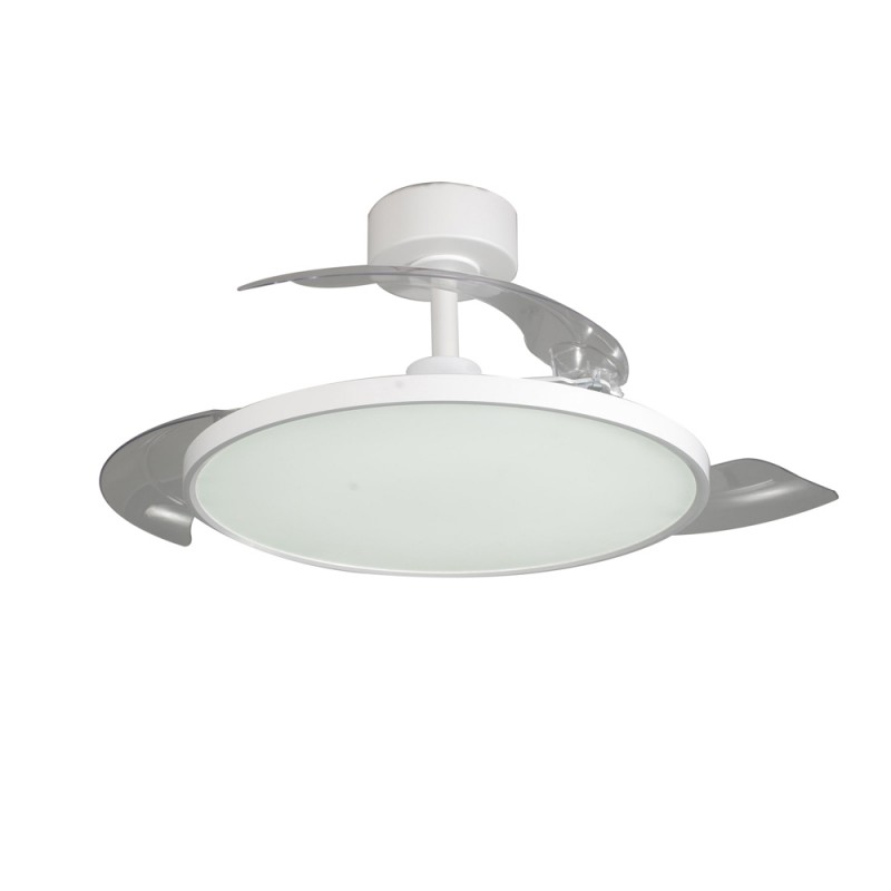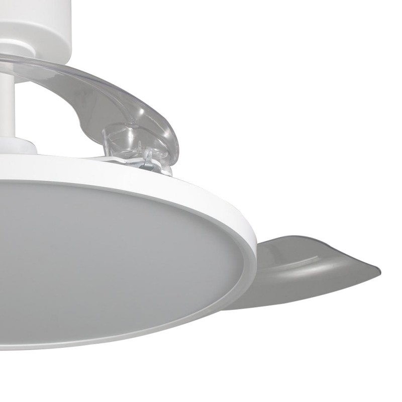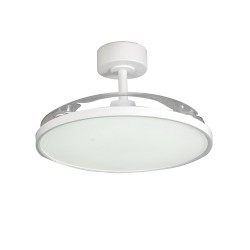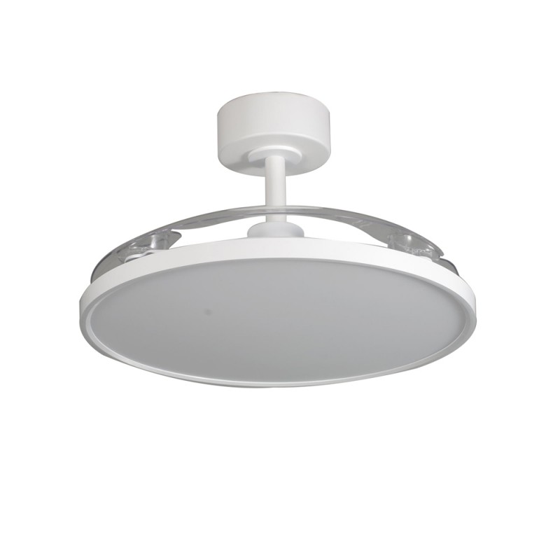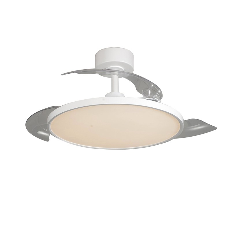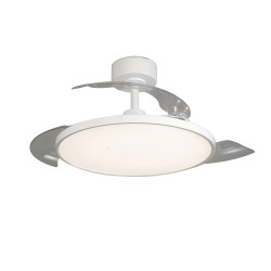 Ventilateur de plafond Mince avec pales rétractables. Ventilateur silencieux de style moderne conçu pour les salons et les chambres à coucher. Vous pouvez choisir entre six vitesses de rotation, sélectionner la rotation inverse ou la fonction brise. Son éclairage LED est réglable en température de couleur et en intensité lumineuse. Fabriqué en acier blanc avec diffuseur en PMMA et trois pales rétractables en ABS.