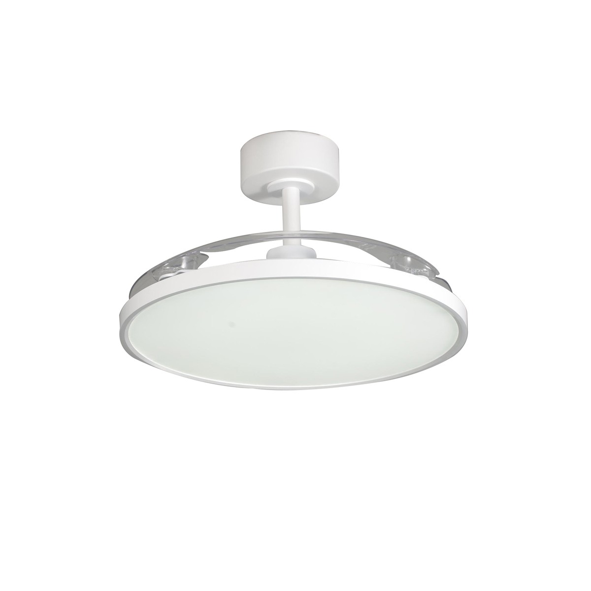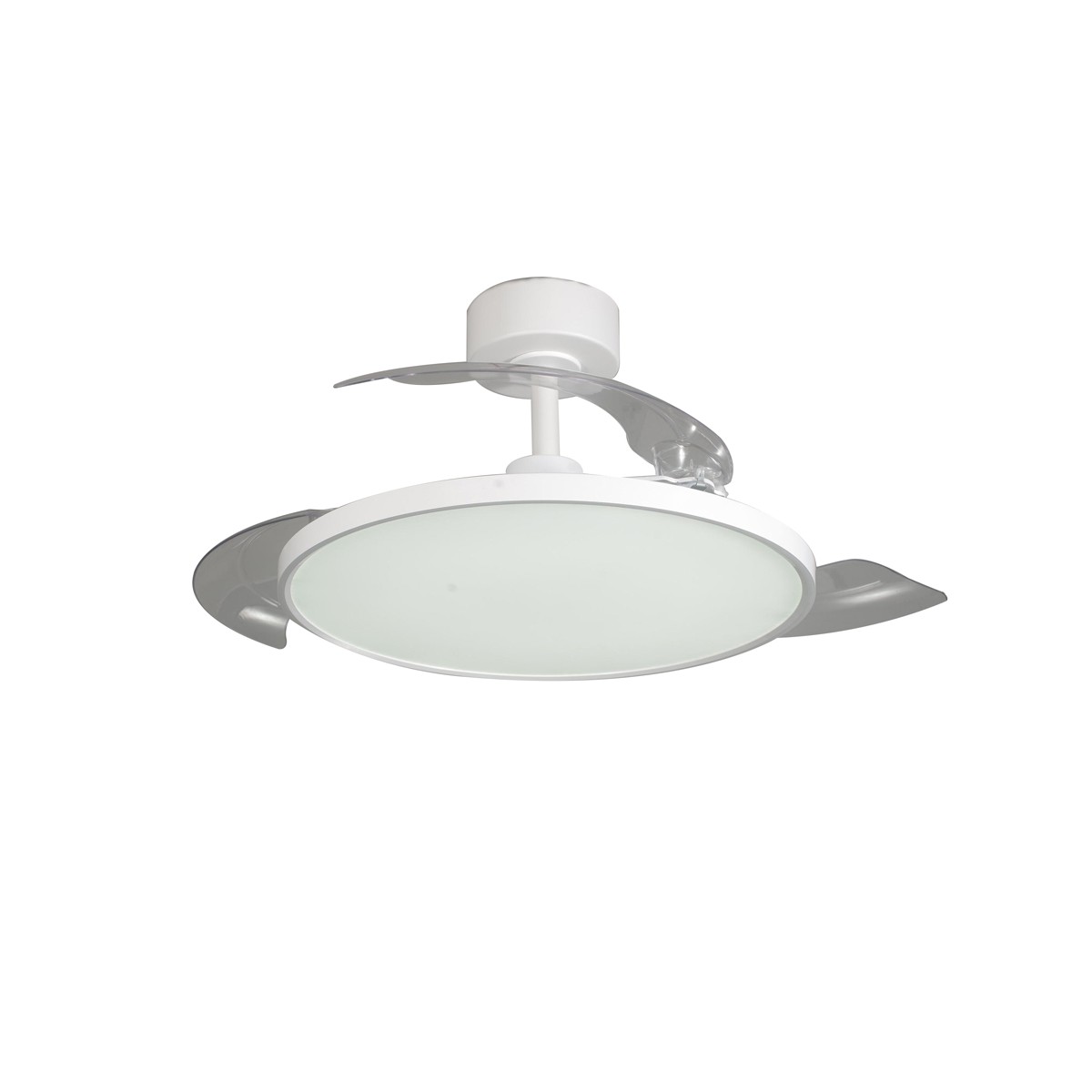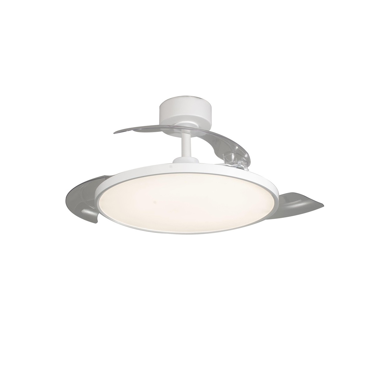 Ventilateur de plafond Mince avec pales rétractables. Ventilateur silencieux de style moderne conçu pour les salons et les chambres à coucher. Vous pouvez choisir entre six vitesses de rotation, sélectionner la rotation inverse ou la fonction brise. Son éclairage LED est réglable en température de couleur et en intensité lumineuse. Fabriqué en acier blanc avec diffuseur en PMMA et trois pales rétractables en ABS.