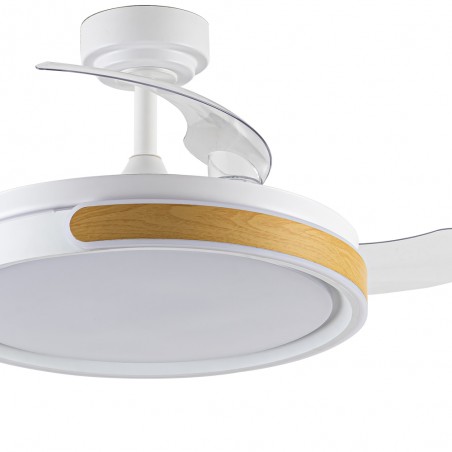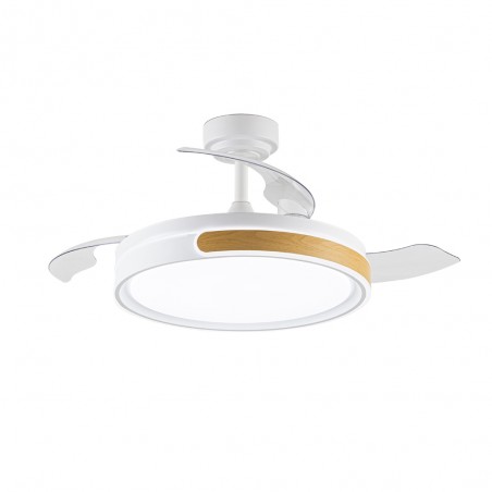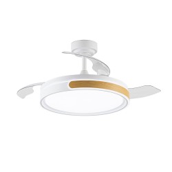 Ventilateur de plafond Movic avec pales rétractables. Ventilateur de style nordique en acier blanc avec une pièce en bois en guise de décoration. Il fournit un flux d'air ainsi qu'un éclairage grâce à sa technologie LED intégrée. Le moteur est à courant continu avec six vitesses de rotation et émet un bruit minimal lorsque le ventilateur fonctionne. La télécommande permet de régler l'éclairage et de contrôler le ventilateur. Trois températures de couleur, mémoire de mise en marche, fonction de rotation inverse et minuterie. Convient aux plafonds inclinés (Max. 18º).