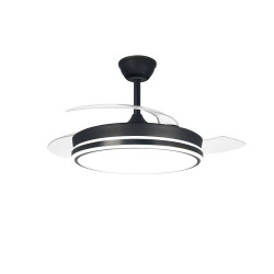 Ventilateur silencieux pour chambres à coucher. Ventilateur noir à pales rétractables spécialement conçu pour les chambres et les salons. Son moteur à courant continu à six vitesses émet un bruit minimal lorsque le ventilateur fonctionne. Il est doté d'un éclairage LED à économie d'énergie et peut être facilement réglé à l'aide de la télécommande. Fonction d'inversion hiver-été, minuterie et mémoire des couleurs. Ventilateur silencieux avec pales rétractables.