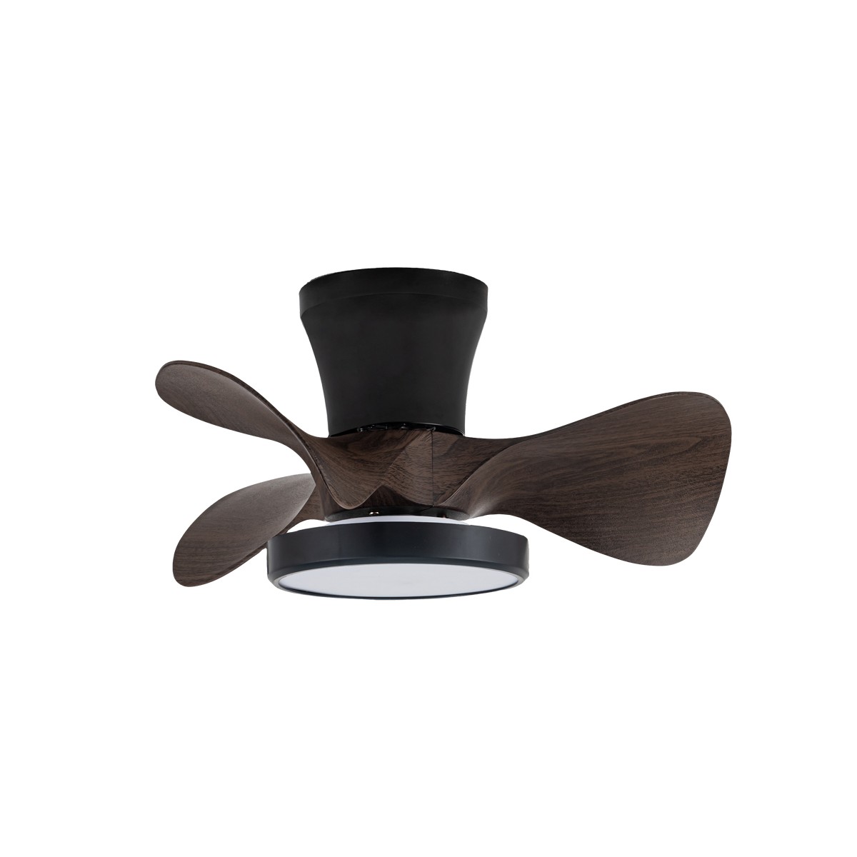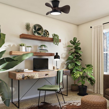 Petit ventilateur de plafond pour les chambres à coucher. Ventilateur silencieux à six vitesses idéal pour l'installation dans les petites pièces (< 13m3). Fabriqué en acier, pales en polycarbonate et diffuseur en PMMA. Couleur noir avec pales en bois foncé. L'arrêt du ventilateur peut être programmé. Eclairage LED intégré réglable en intensité et en couleur. Télécommande incluse.