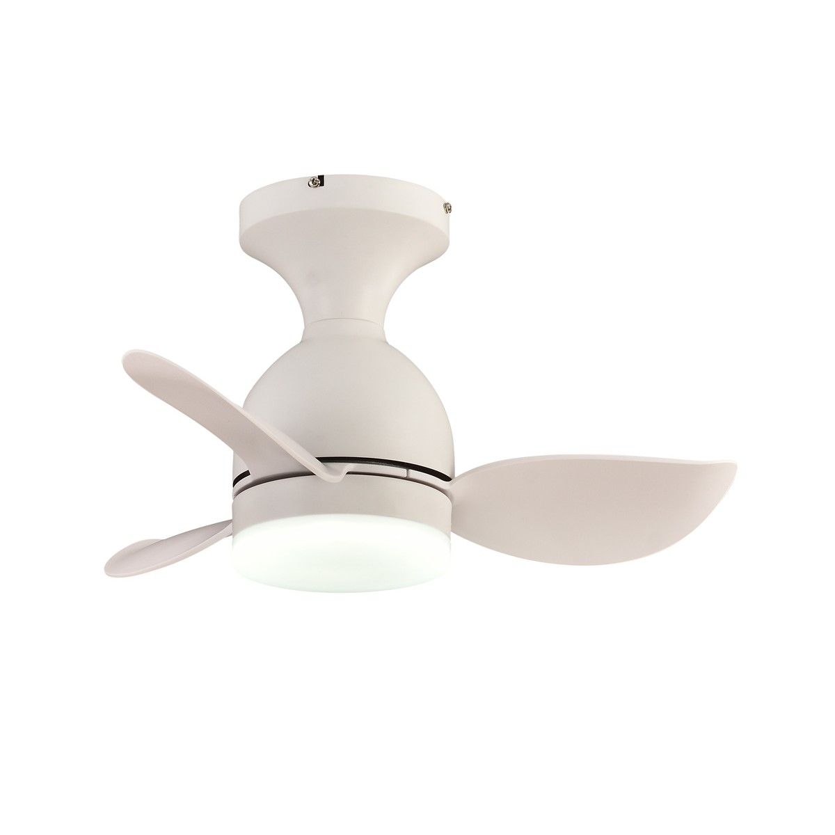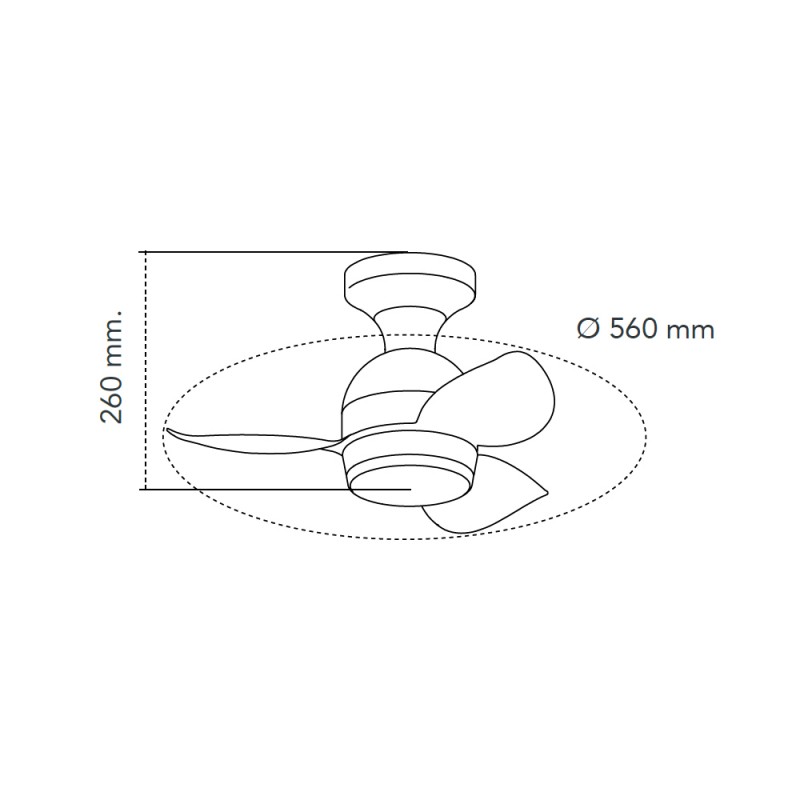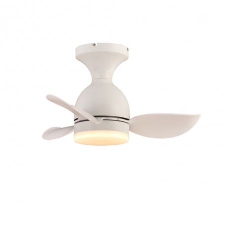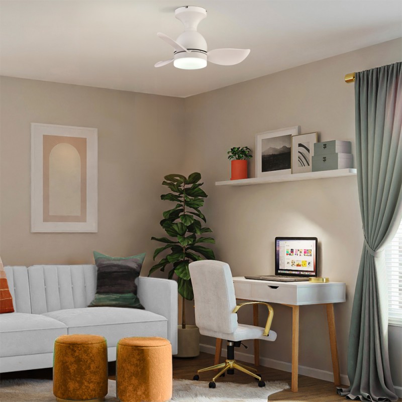 Ventilateur de plafond pour chambres d'enfants. Petit ventilateur à trois pales idéal pour être placé au plafond des chambres d'enfants. Il fournit un flux d'air agréable et émet très peu de bruit pendant son fonctionnement grâce à son moteur à courant continu. Il dispose en outre d'un éclairage LED réglable en température de couleur et en intensité lumineuse. Minuterie, fonction de rotation inverse et mémoire de mise en marche. Télécommande incluse.