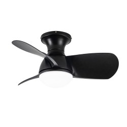 Ventilateur de plafond avec éclairage LED pour les petites pièces. Ventilateur de plafond de petite taille conçu pour les chambres et les pièces de moins de 13 mètres carrés. L'éclairage LED est réglable en intensité et en température de couleur. Le moteur à courant continu émet très peu de bruit et dispose de six vitesses de rotation. Ventilateur noir silencieux avec trois pales en ABS.