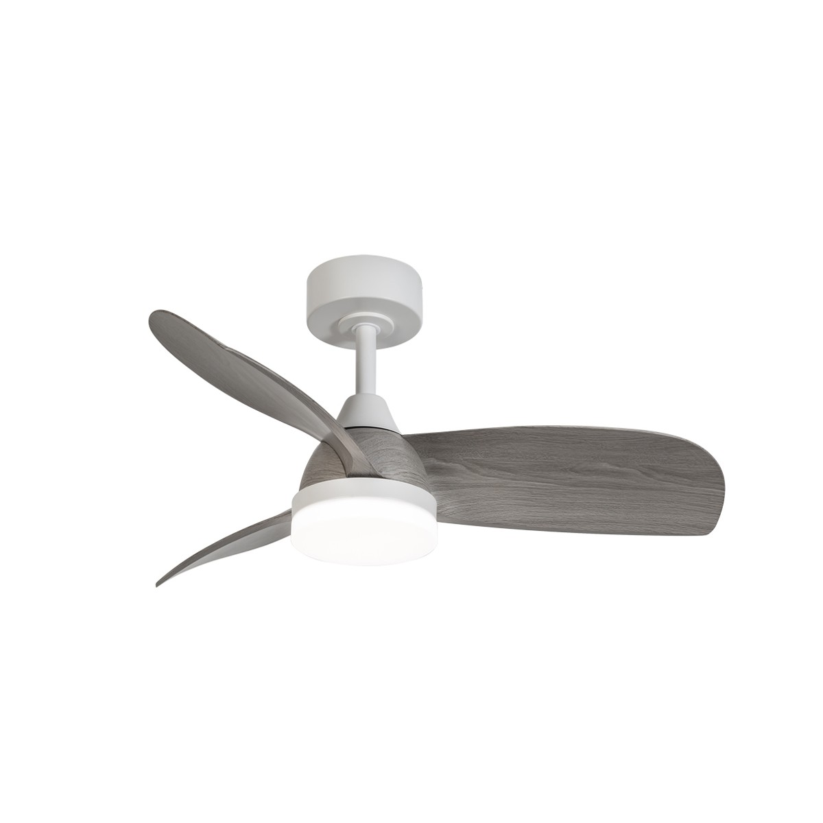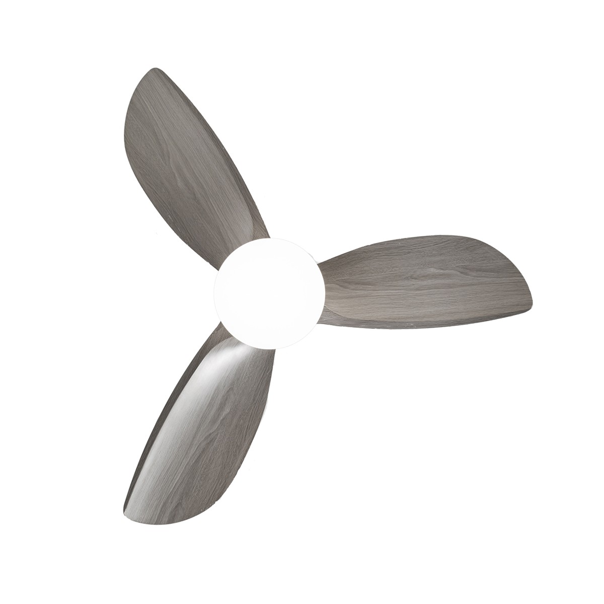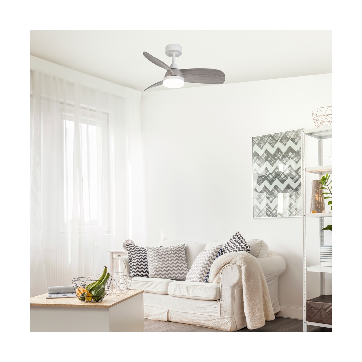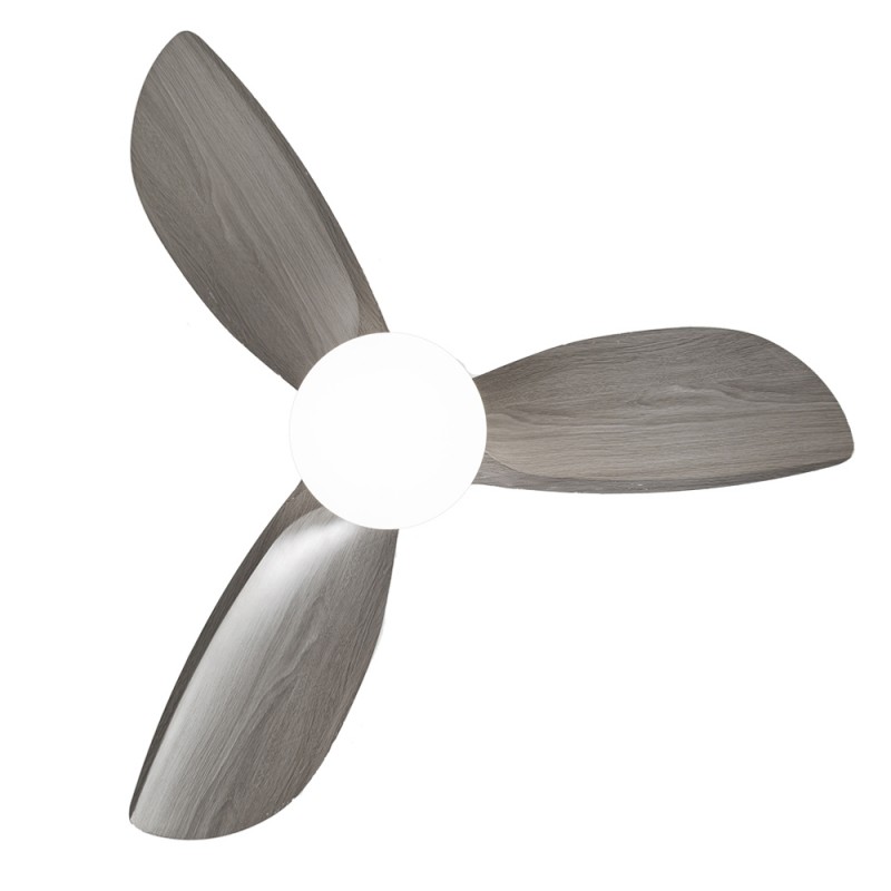 Ventilateur de plafond Byan pour les chambres à coucher et les salles de séjour. Ventilateur silencieux très pratique comme source de lumière et de ventilation dans les chambres à coucher et les pièces de taille moyenne. Moteur à courant continu à six vitesses de rotation, fonction d'inversion et minuterie pour programmer son arrêt. Il dispose d'un éclairage LED intégré réglable en température de couleur et en intensité lumineuse. Couleur blanche avec des lames en ABS effet bois gris cendré.