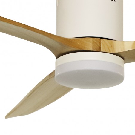 Grand ventilateur de plafond avec moteur à courant continu qui réduit la consommation d'énergie tout en déplaçant une grande quantité d'air, ce qui en fait un ventilateur très efficace. Il s'installe directement au plafond, sa hauteur n'est pas réglable. Ce ventilateur dispose de 6 vitesses et d'une fonction été/hiver qui permet de l'utiliser toute l'année. Ses trois pales sont en bois naturel. Il dispose d'un éclairage LED intégré de 15W avec trois tonalités de lumière. Grâce à la fonction mémoire, il permet de retrouver la dernière lumière allumée. Vous pouvez programmer le fonctionnement du ventilateur par périodes de 30' - 2 heures et à la fin du temps programmé, le ventilateur s'éteint.