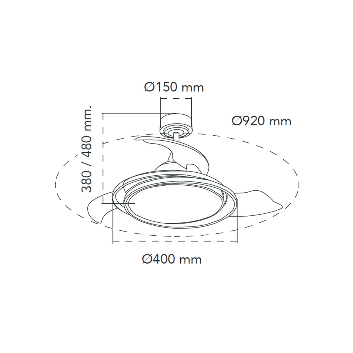 Ventilateur de plafond Antila Mini LED en blanc. Ventilateur avec moteur DC ultra-silencieux avec six vitesses de rotation, fonction inversée hiver été et brise. Sa conception avec pales rétractables signifie que lorsque le ventilateur n'est pas en fonctionnement, les pales sont rétractées sur le dessus du ventilateur. Vous pouvez allumer uniquement la lumière principale, uniquement l'anneau décoratif ou l'ensemble du ventilateur en même temps à l'aide de la télécommande.