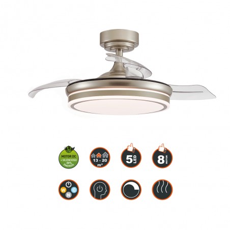 Ventilateur de plafond Mini Moss à LED pour les petites pièces. Ventilateur de plafond à pales rétractables conçu pour assurer la circulation de l'air et l'éclairage dans les chambres à coucher et les petits salons. Il dispose d'un moteur ultra-silencieux avec 6 vitesses de rotation, une fonction d'inversion hiver-été, une minuterie et une fonction de brise. Quant à l'éclairage, vous pouvez définir trois tons d'éclairage (chaud, neutre ou froid) et faire varier l'intensité des lumens. Le corps de l'éventail est nickel et les pales pliantes sont transparentes.
