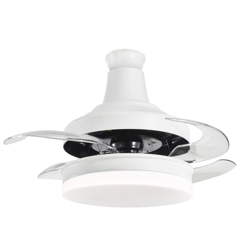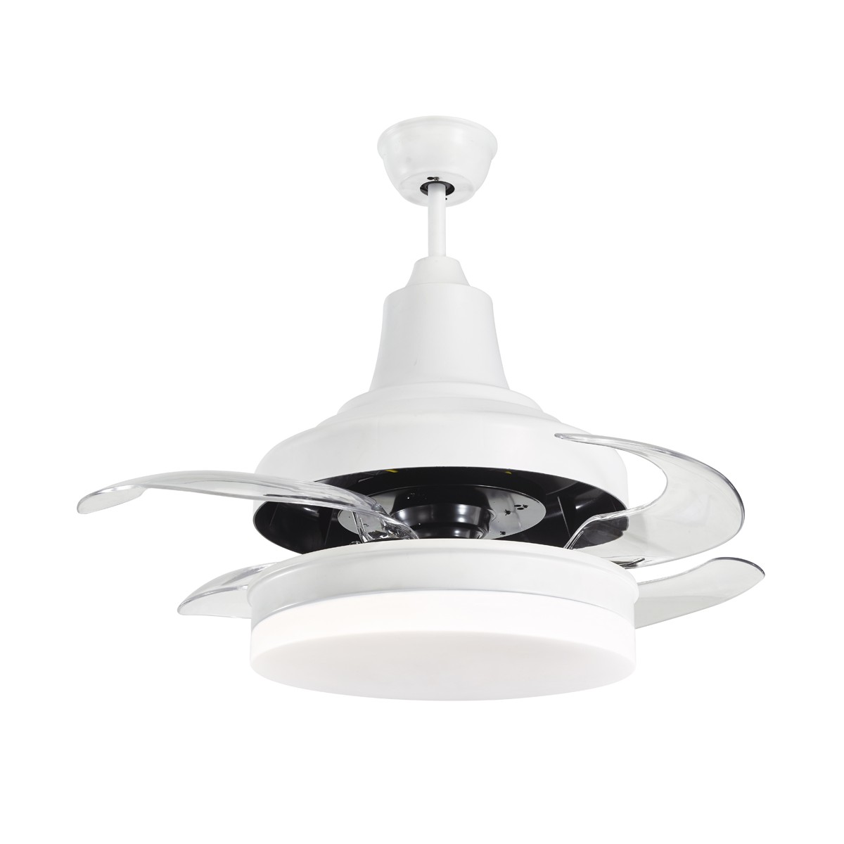 Ventilateur de plafond sur le toit avec moteur DC à 6 vitesses. Eclairage LED de 55W avec trois tons de lumière et intensité réglable. Quand le Ventilateur est éteint, les pales sont cachées à l'intérieur du boîtier du ventilateur. Lorsqu'il est allumé, la partie inférieure du ventilateur descend pour permettre aux pales de se déplier. Y compris le minuteur.