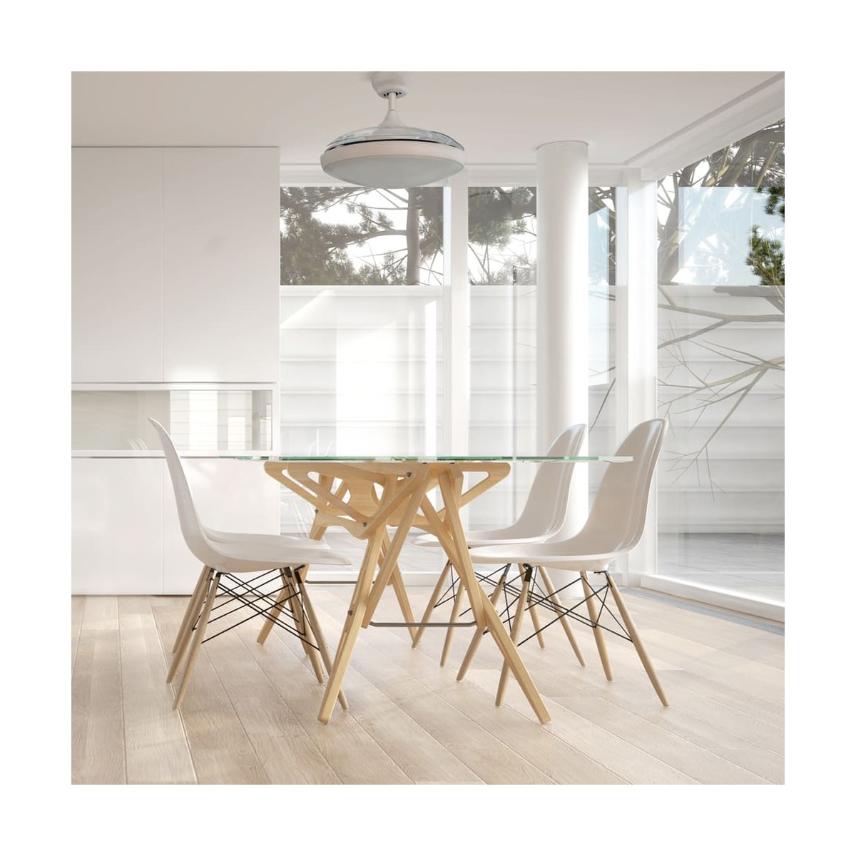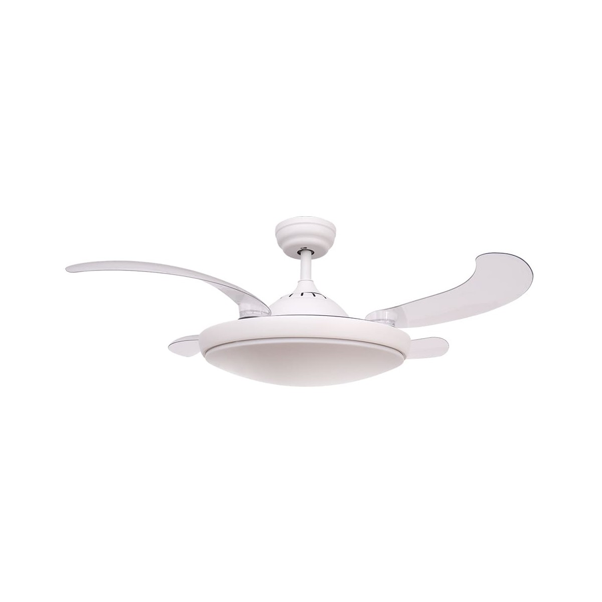 Ventilateur de plafond de Plafonnierd avec moteur AC à trois vitesses. Les pales se replient dans le boîtier du Ventilateur de Plafonnierd lorsqu'il est éteint. LED intégrée de 47W avec 4200 lm et trois nuances de lumière. Comprend une télécommande avec fonction de minuterie pour programmer l'arrêt du ventilateur.