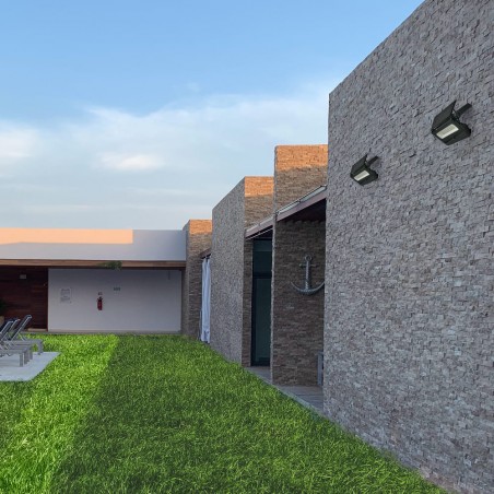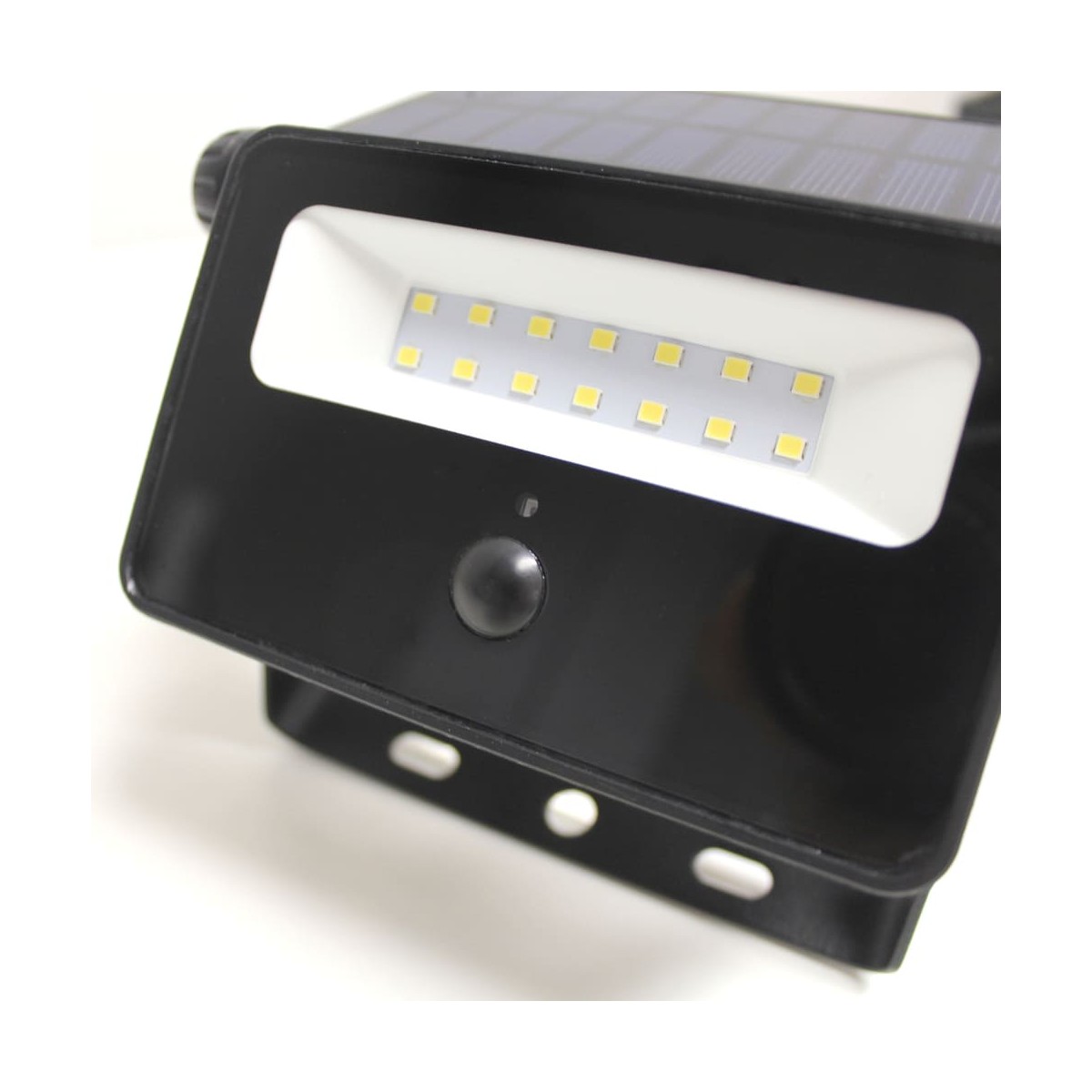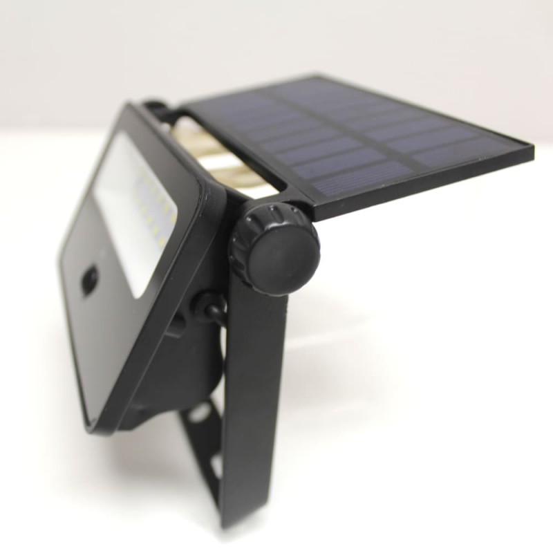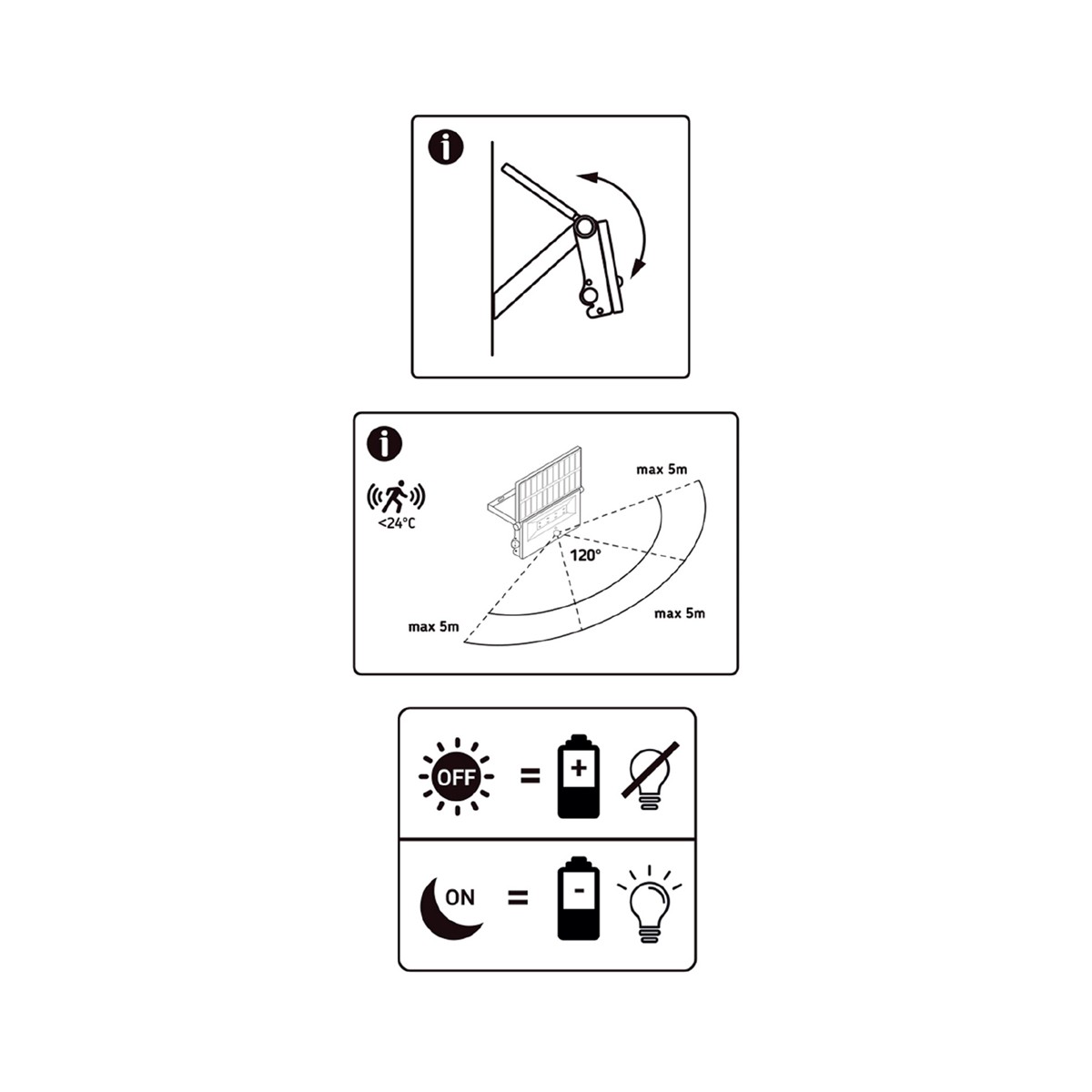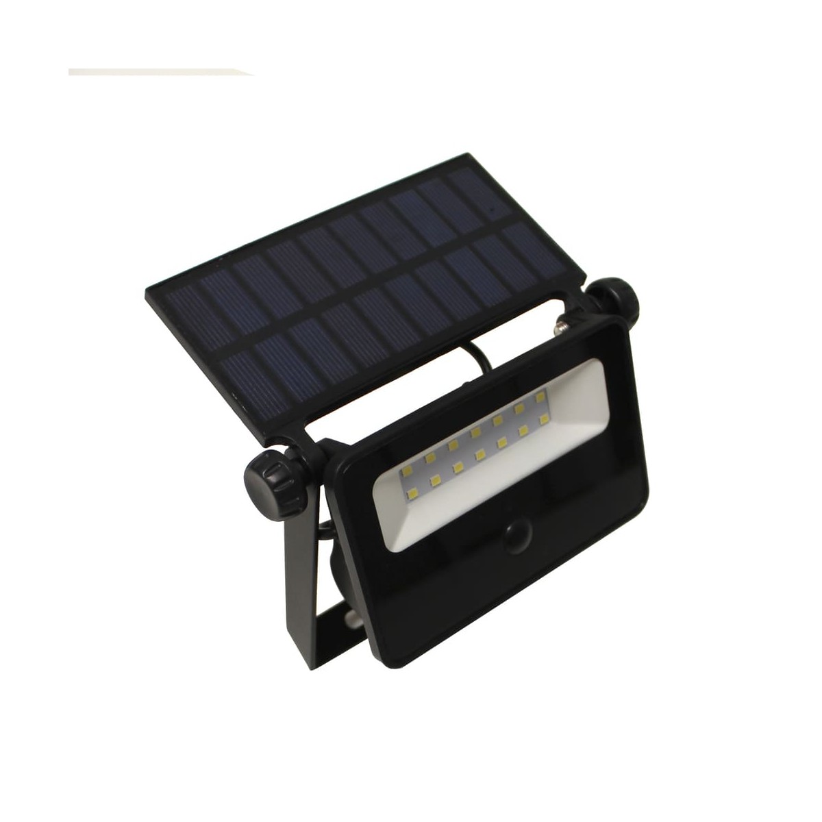 Projecteur solaire à LED avec détecteur de mouvement et de crépuscule. Ce projecteur à LED est conçu pour éclairer les espaces extérieurs tels que les terrasses et les jardins. Elle est équipée d'un panneau solaire qui recharge la batterie pendant la journée (autonomie de 8 à 10 heures). La face avant est équipée d'un détecteur de présence et de crépuscule. Les deux sont activés en même temps, il n'est pas possible d'en allumer un seul individuellement.