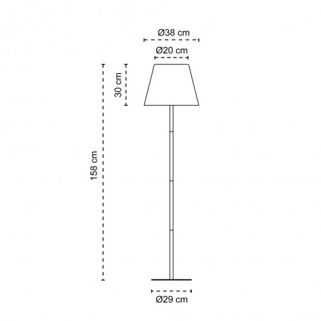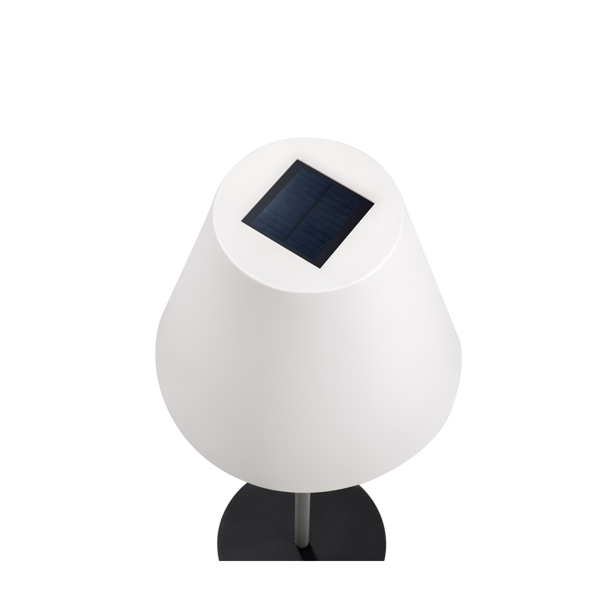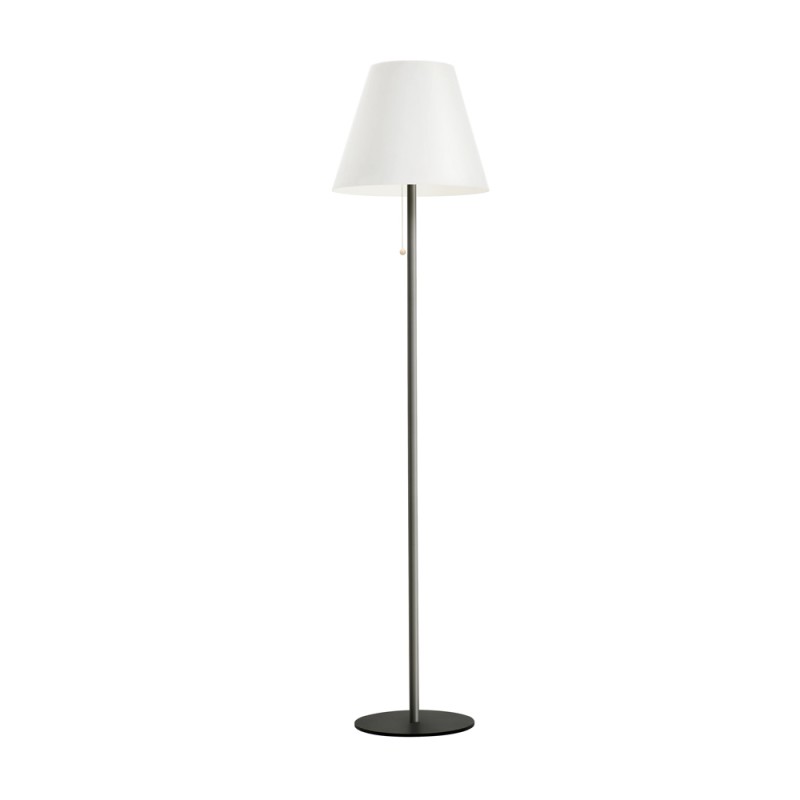 Lampadaire solaire pour l'éclairage extérieur. Lampadaire au design pratique conçu pour éclairer une terrasse ou un jardin. Il est doté d'un éclairage LED intégré dans un ton blanc chaud et s'allume et s'éteint à l'aide d'une simple poignée en corde. Au sommet de l'abat-jour se trouve un panneau solaire qui permet de recharger la batterie de la lampe grâce à la lumière du soleil. La batterie a une autonomie de 8 heures (6 à 8 heures de charge).