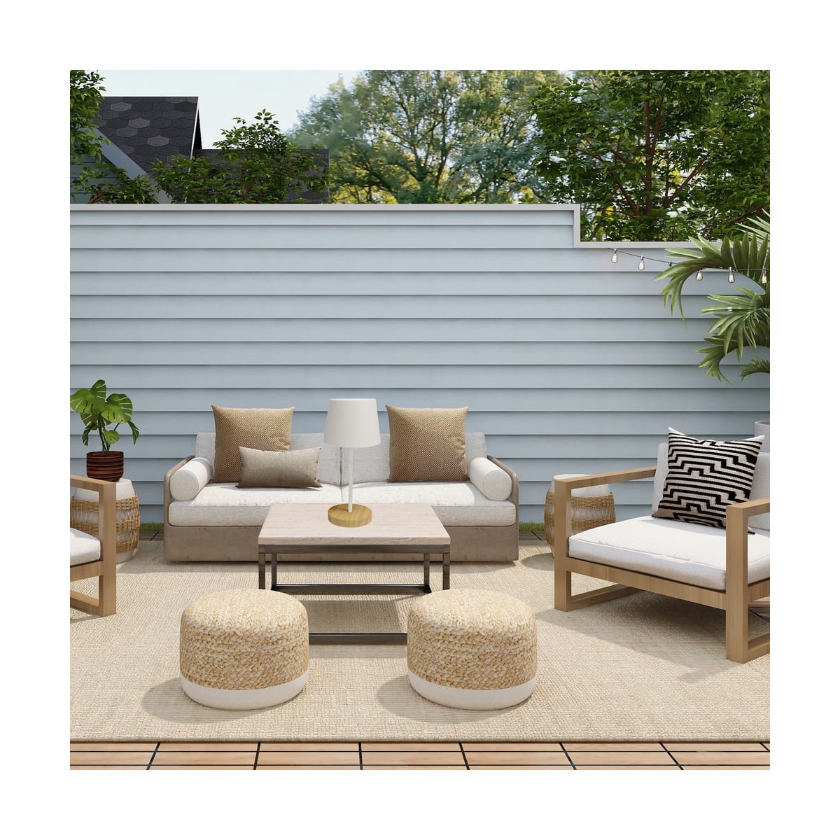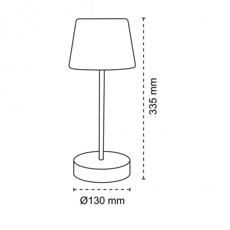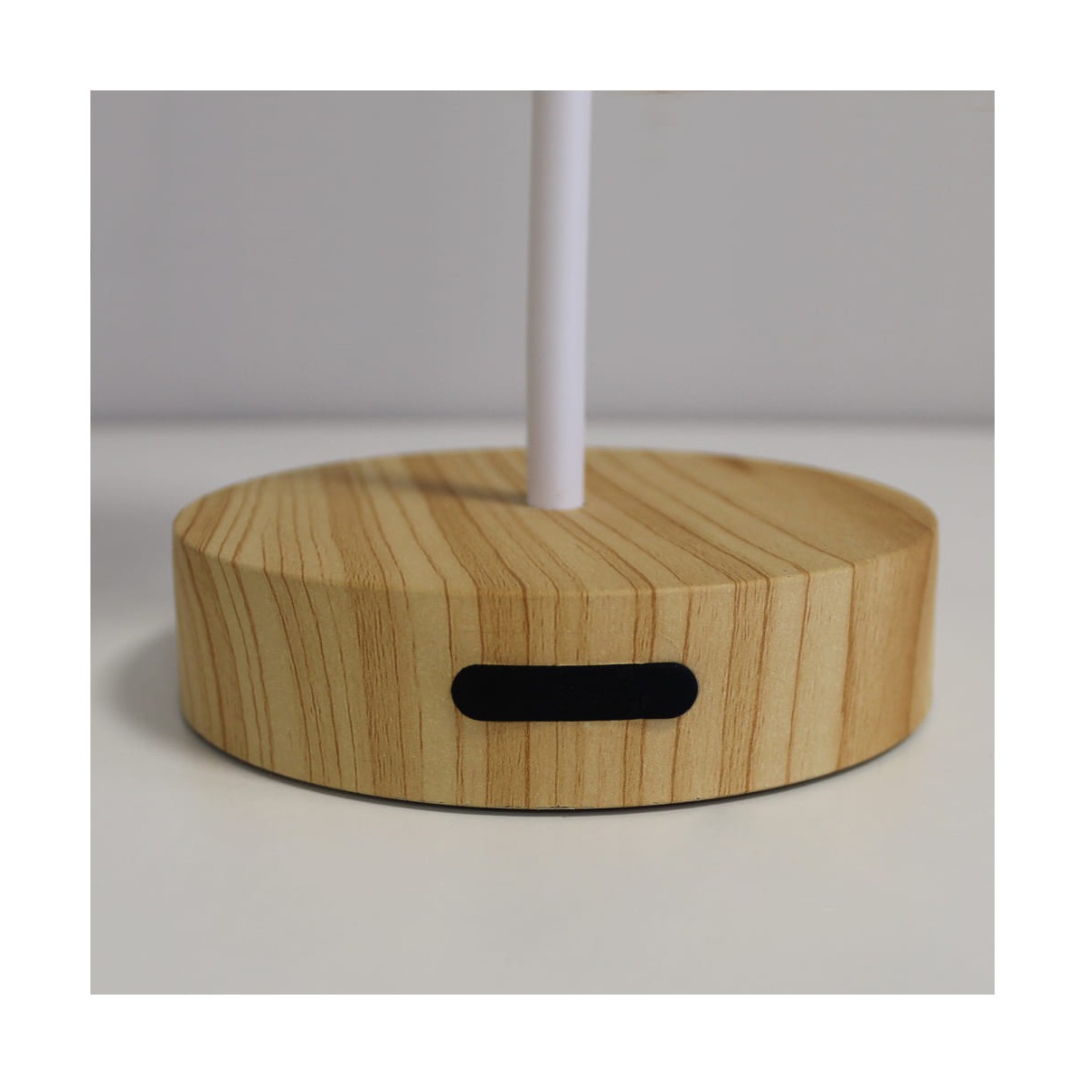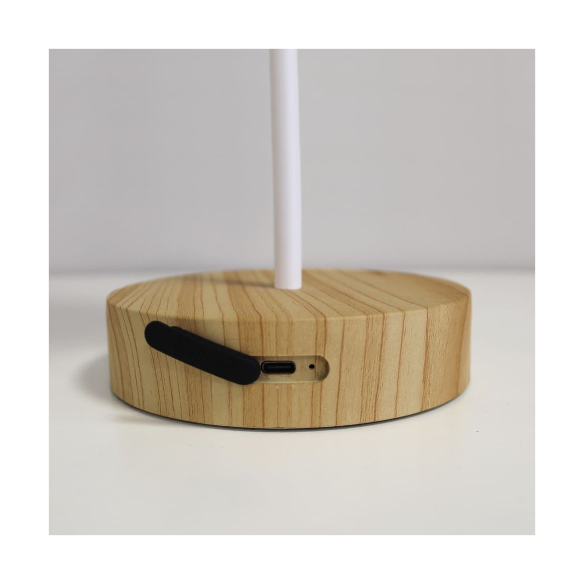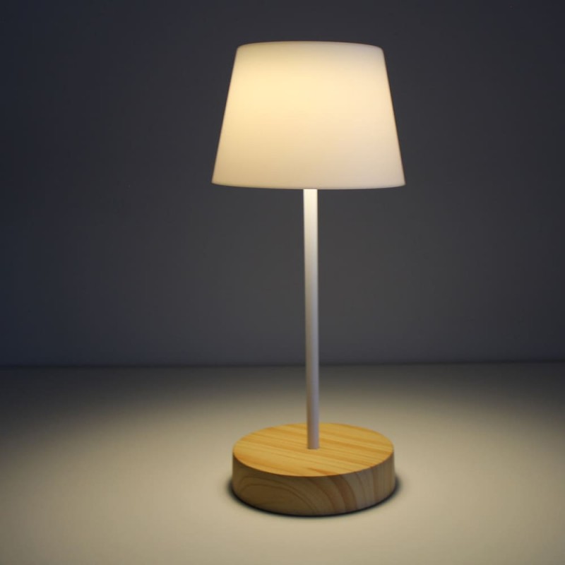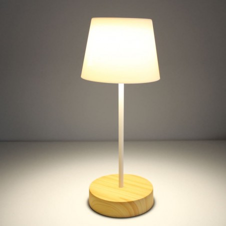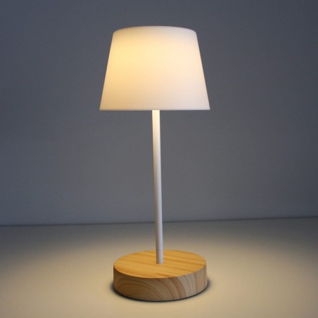 Lampe de table avec batterie rechargeable pour jardins et terrasses. Lampe de table moderne conçue pour fournir un éclairage chaleureux pour les dîners et les réunions en plein air. La lumière s'allume facilement en appuyant sur la partie supérieure de l'abat-jour. En outre, vous pouvez modifier l'intensité lumineuse en fonction du nombre de pressions (100%-50%-10%-OFF). Le socle est équipé d'un port USB pour recharger la batterie de la lampe (autonomie jusqu'à 10 heures). Lampe blanche avec base effet bois et abat-jour opale.