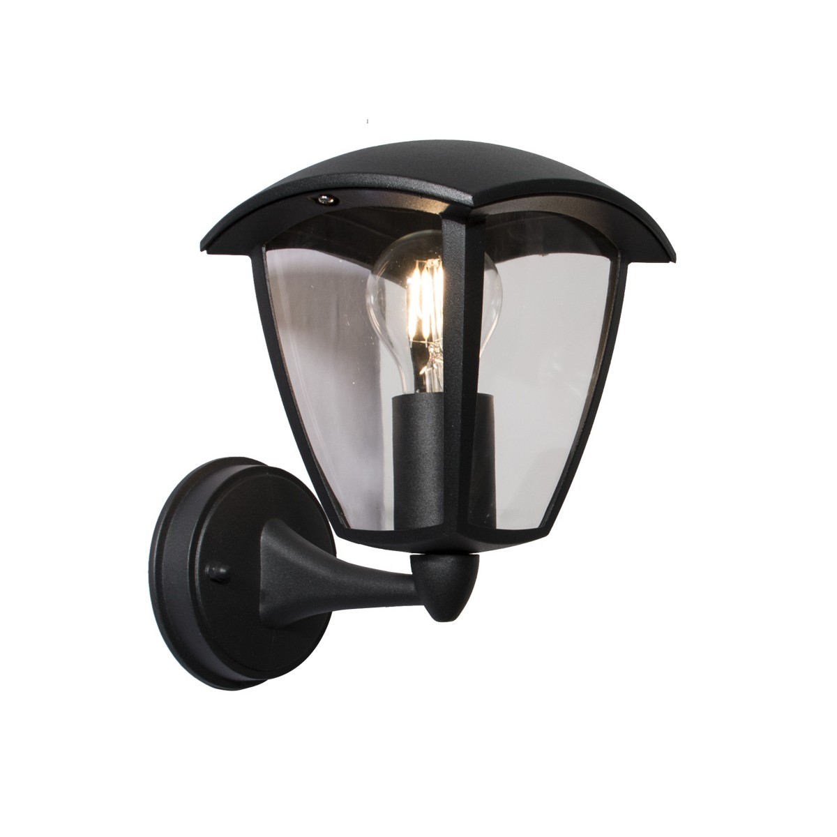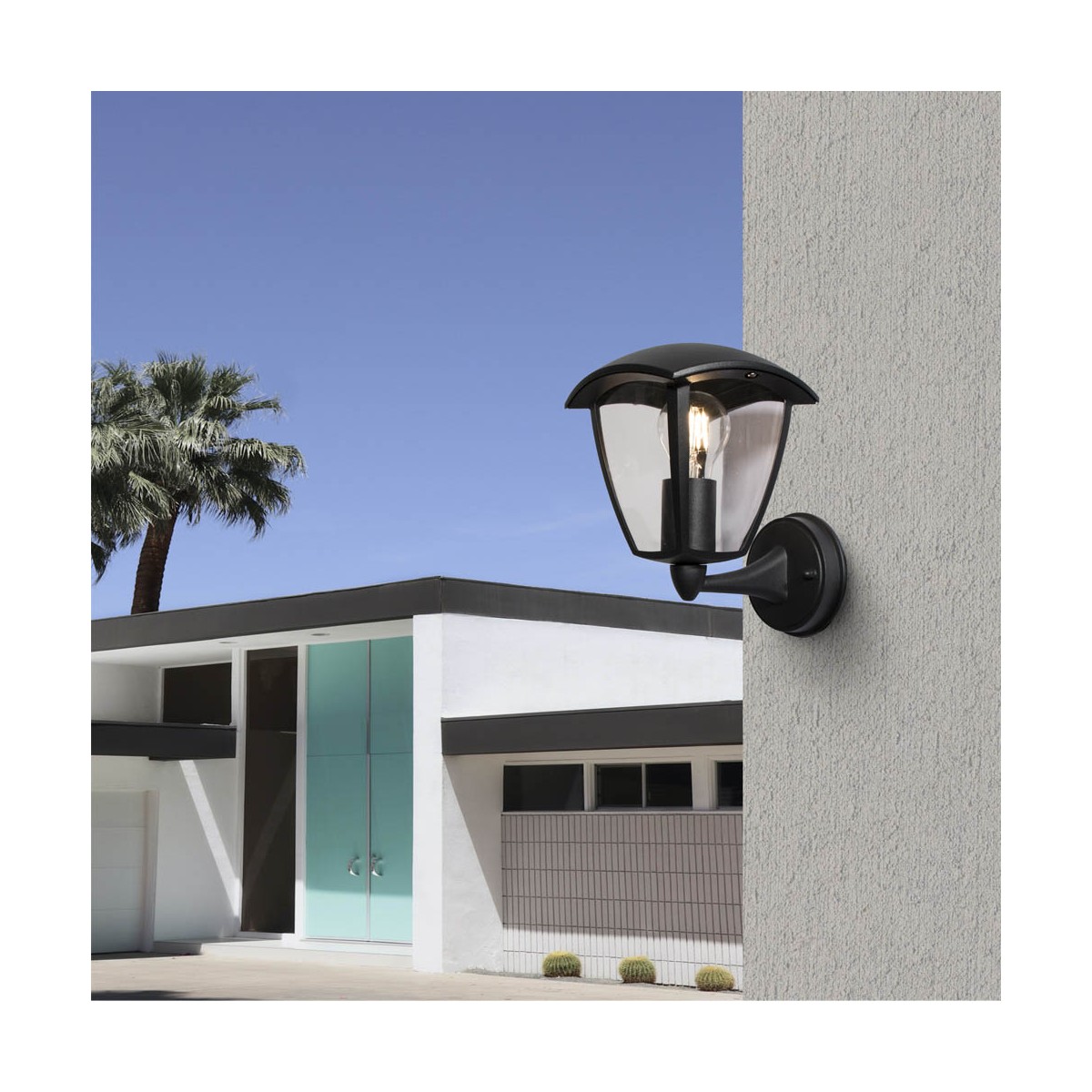Applique d'extérieur Durham. Applique conçue pour les murs extérieurs tels que les porches, les jardins et les terrasses. Elle a un indice de protection IP44, est fabriquée avec une structure en aluminium noir et des diffuseurs en PMMA qui protègent l'ampoule. Les diffuseurs sont transparents, ce qui favorise la diffusion de la lumière autour de l'applique. L'ampoule n'est pas incluse.
