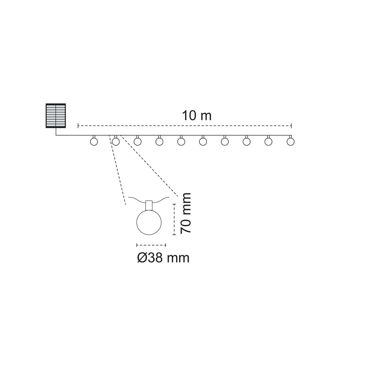 Guirlande solaire pour l'éclairage extérieur. Longueur de 10 mètres avec 10 points lumineux d'une puissance totale de 4W. Elle dispose d'une batterie rechargeable avec panneau solaire ou câble USB, avec une autonomie allant jusqu'à 6 heures. Guirlande de LED avec panneau solaire conçue pour illuminer les jardins et les terrasses des maisons, des restaurants et des hôtels.