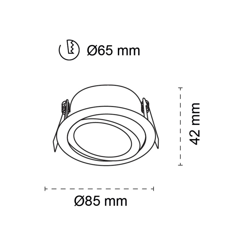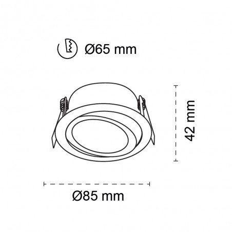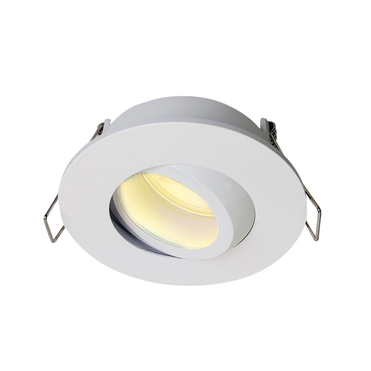 Luminaire encastré orientable Acuario pour salles de bains. Encastré circulaire compact en blanc, très pratique pour l'éclairage fonctionnel des salles de bains et des pièces exposées à l'eau et à l'humidité. Une fois l'ampoule (GU10) installée, le point lumineux peut être incliné de 30º pour orienter légèrement l'éclairage. Installation encastrée dans le plafond avec un trou de 68 mm de diamètre. IP65.