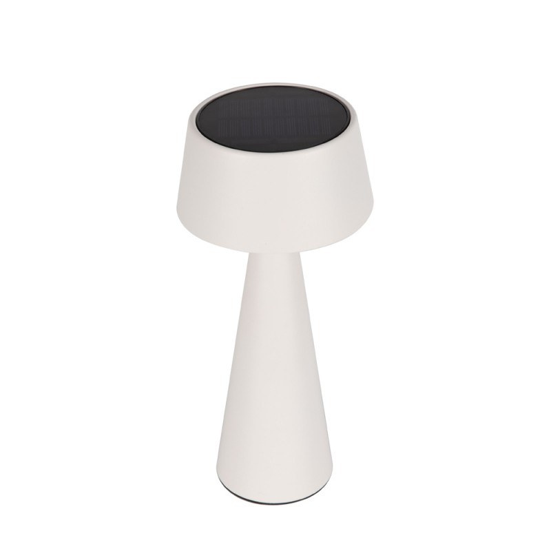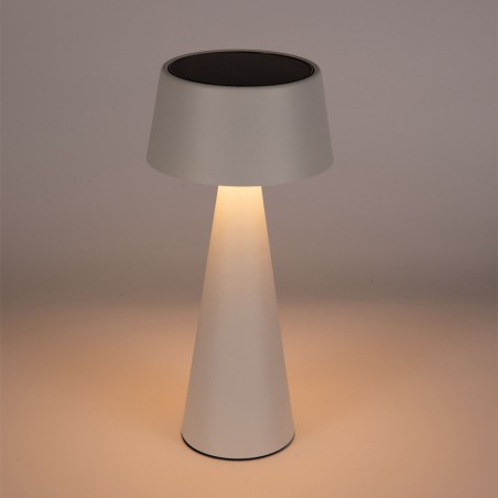 Lampe de table rechargeable Allua. Lampe de table moderne conçue pour apporter un éclairage chaleureux lors des dîners et des réunions en plein air. La lumière s'allume simplement en appuyant sur le dessus de la lampe, et son intensité peut être réglée. La tête est magnétique et peut être retirée de la base. Vous pouvez recharger la batterie de la lampe en la branchant sur le secteur ou à l'aide de la lumière du soleil grâce à son panneau solaire.