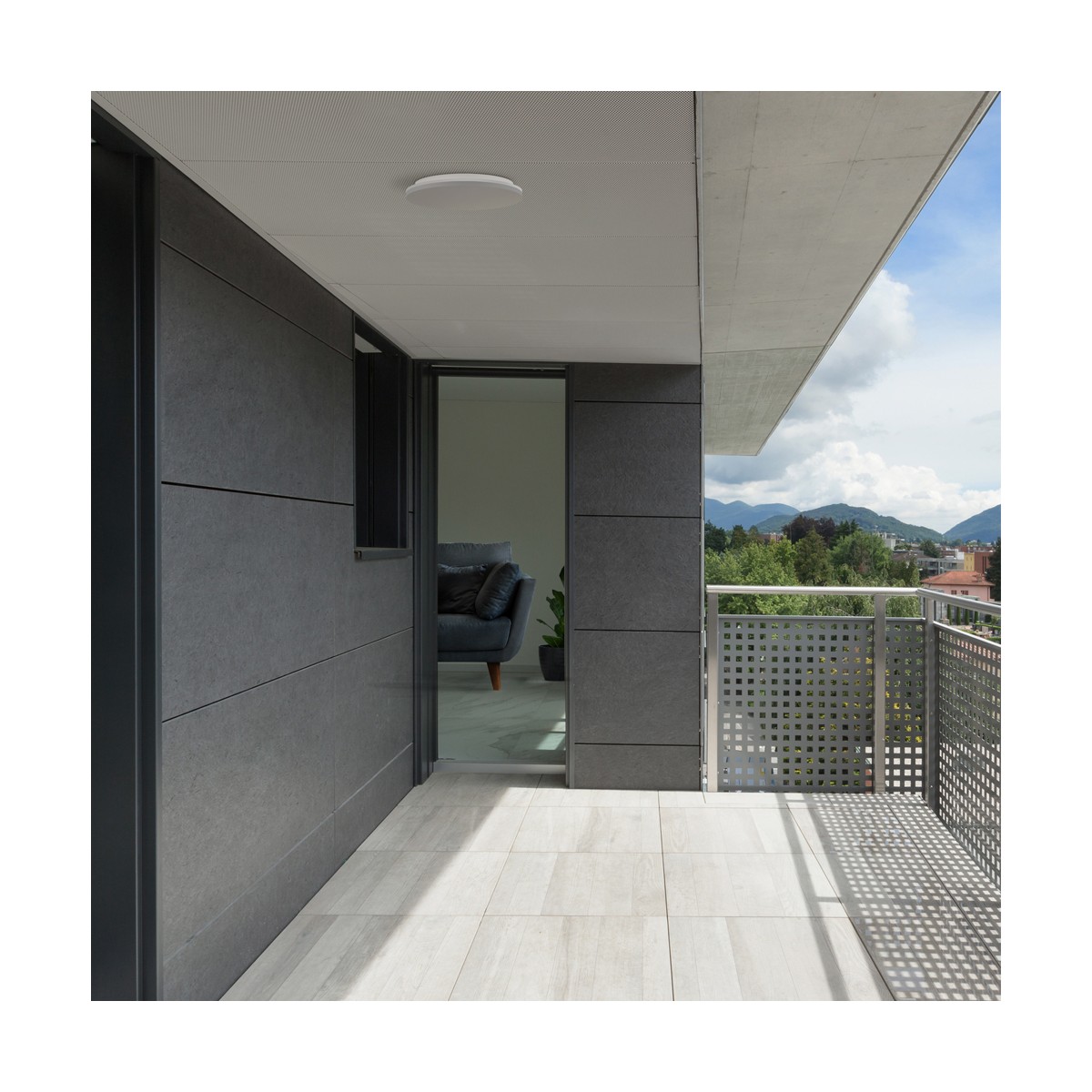 Plafonnier technique rond à LED en saillie. Haut IP 54 en température froide 6400K et 1200 Lumens. Parfait comme éclairage principal ou auxiliaire à installer sur les plafonds et les murs de vos balcons, terrasses, patios, façades, porches et également comme éclairage de salle de bain.
