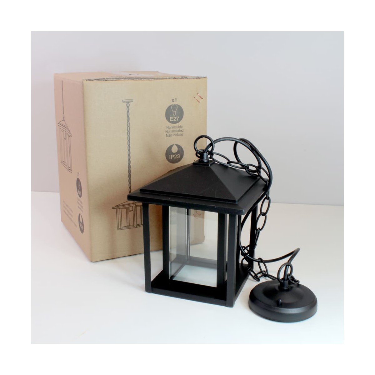 Suspension d'exterieur pour les jardins et les terrasses avec IP23. Cette applique pour ampoules E27 est dotée d'un abat-jour en verre transparent pour couvrir l'ampoule. Structure en aluminium laqué noir mat. Vous pouvez combiner le suspension avec l'applique Ronda.