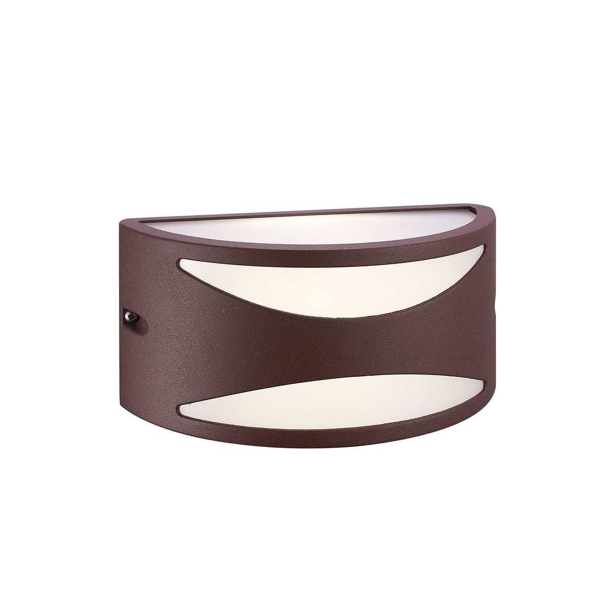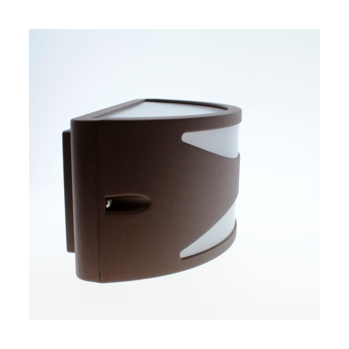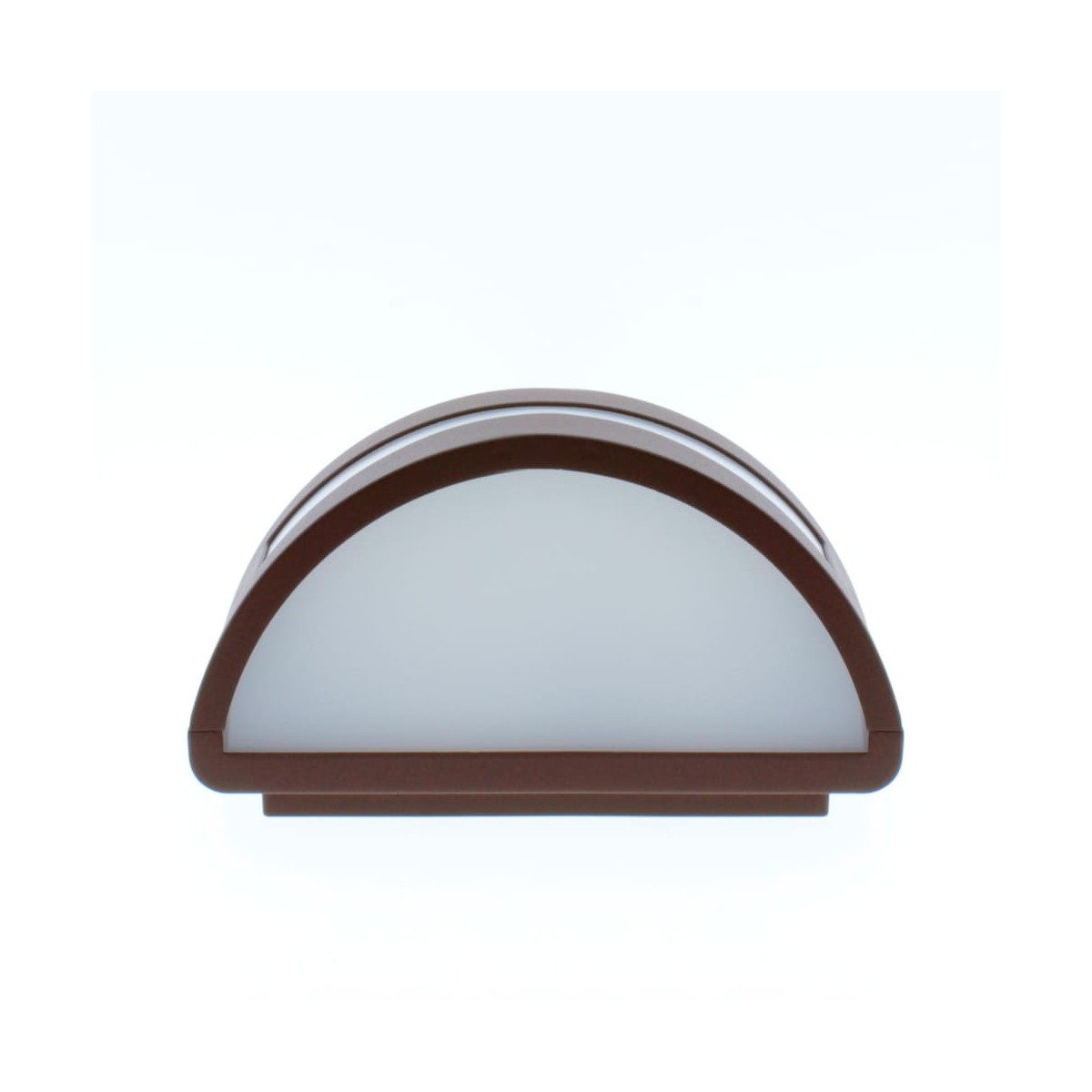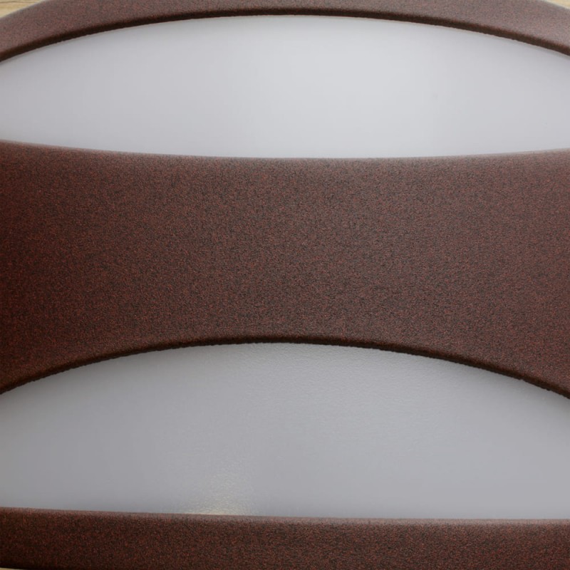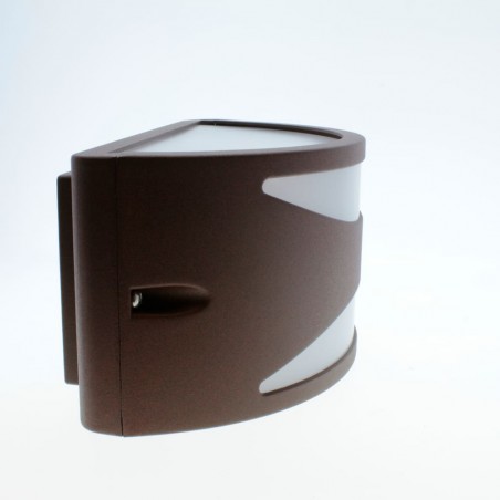 Applique murale adaptée à un usage extérieur avec IP44. Structure en aluminium laqué brun rouille, avec diffuseur blanc opaque et translucide. Pour ampoule E27, non incluse.