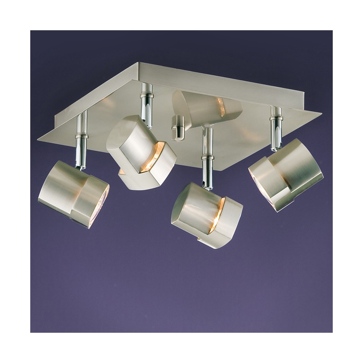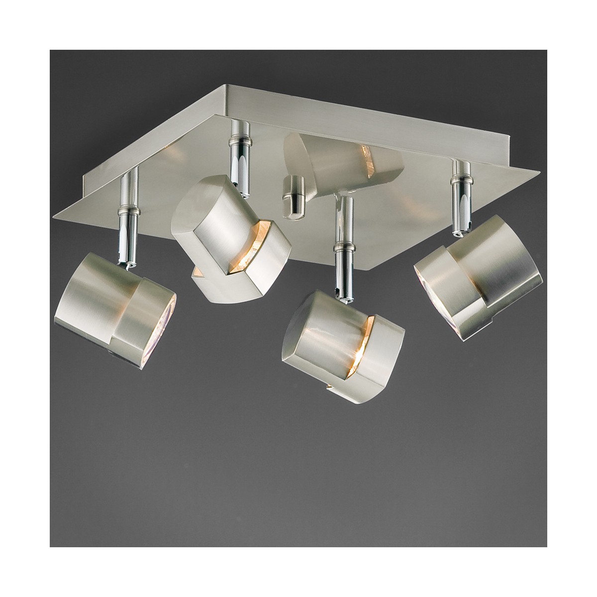Plafonnier carré à 4 lumières en finition satinée pour ampoules GU10. Ampoules non comprises. Compatible avec une ampoule LED.