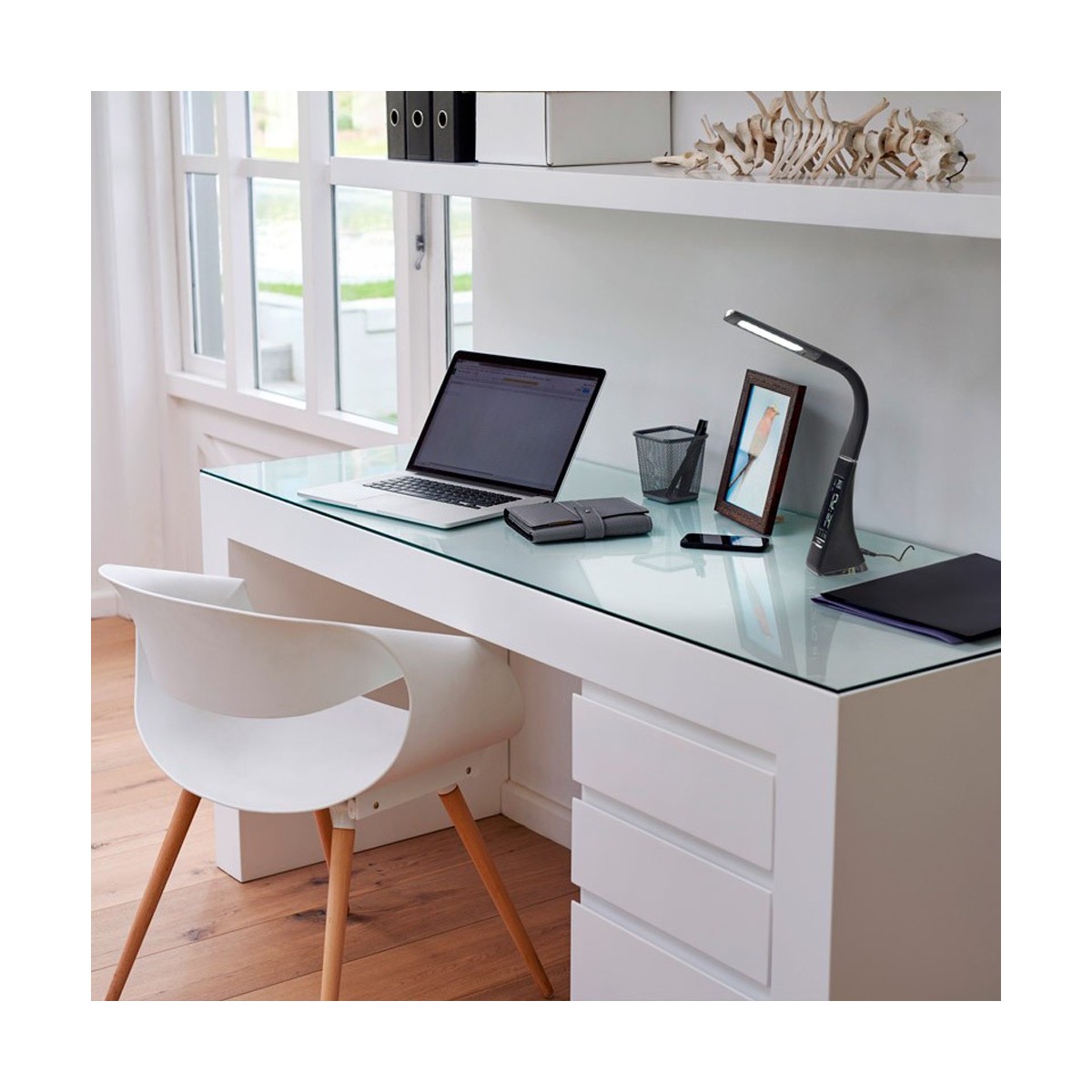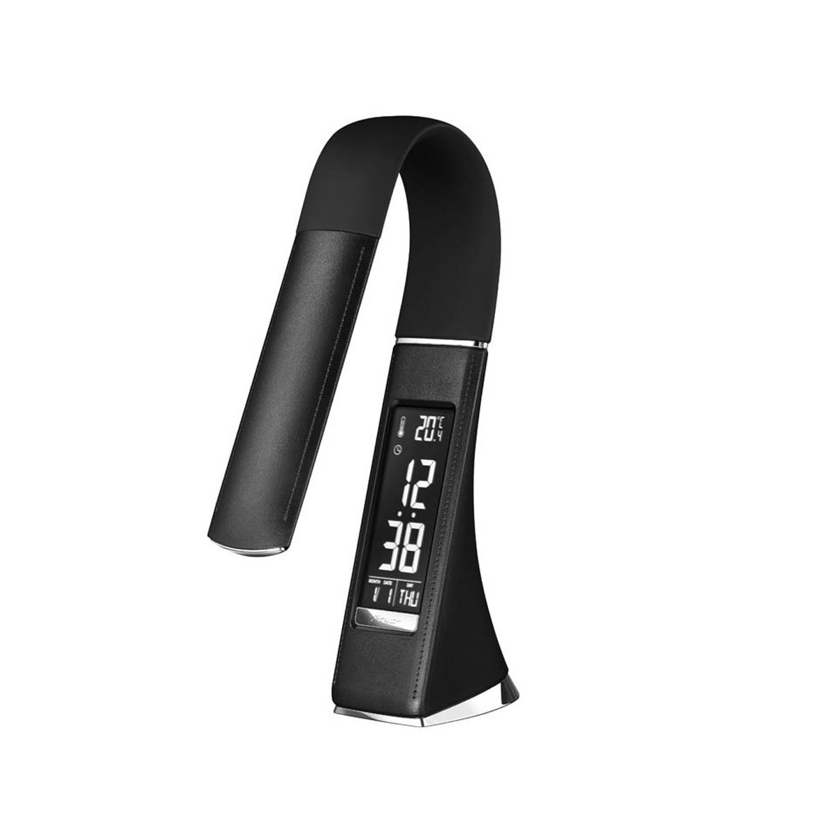 Lampe du bureau Led en finition cuir noir avcc 5W et lumiere froid 5500K. Lampe de bureau avec corps flexible qui permet de régler l'orientation de la lumière et de choisir entre 3 intensités. Il est doté d'une horloge numérique et d'un indicateur de température. Pile incluse.