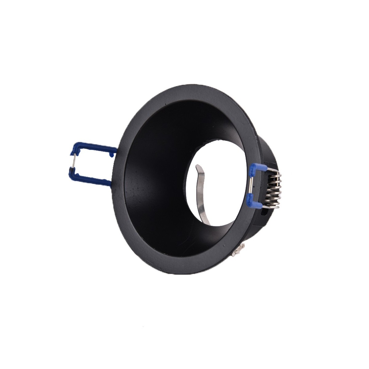 Spot encastré arrondi fixe en aluminium avec finition noire. Comprend un support de lampe GU10. L'encastrement ne comprend PAS d'ampoule.