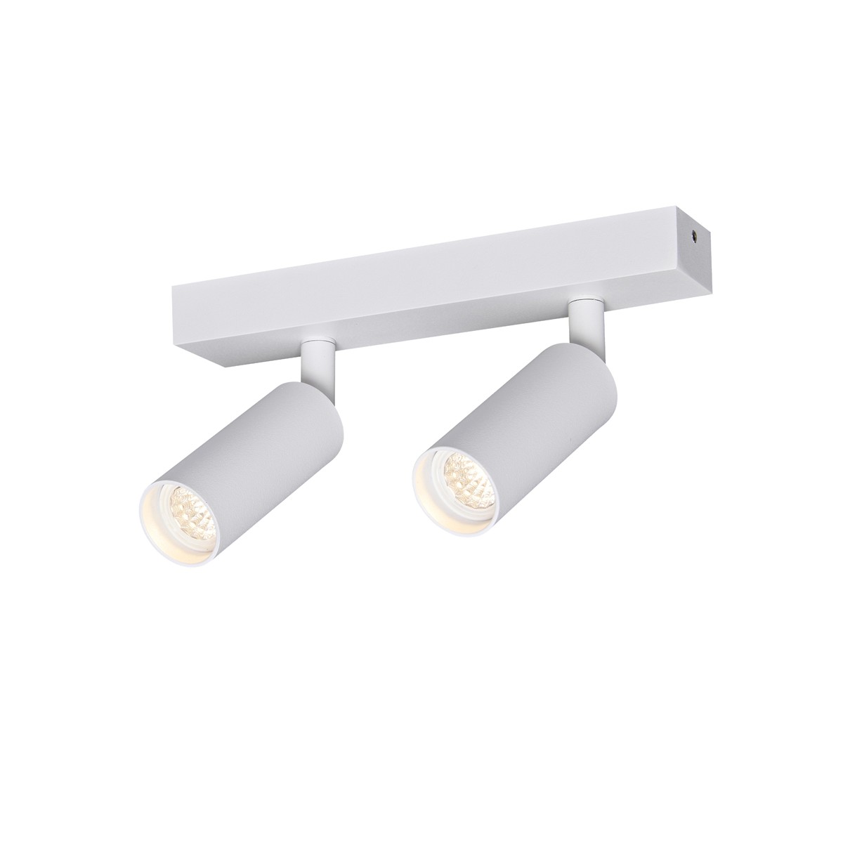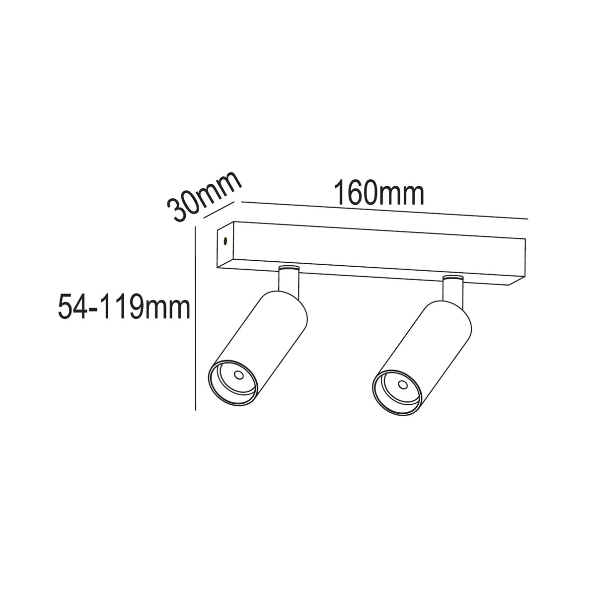 Bandeau de spots Slim et réglables avec deux spots. Spots tubulaires en aluminium pour ampoules LED G9 (non incluses). Chaque spot peut être déplacé pour diriger la lumière vers l'endroit souhaité. Finition blanche sablée. Installation au plafond ou au mur. Base 30x160 mm.