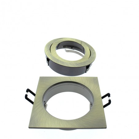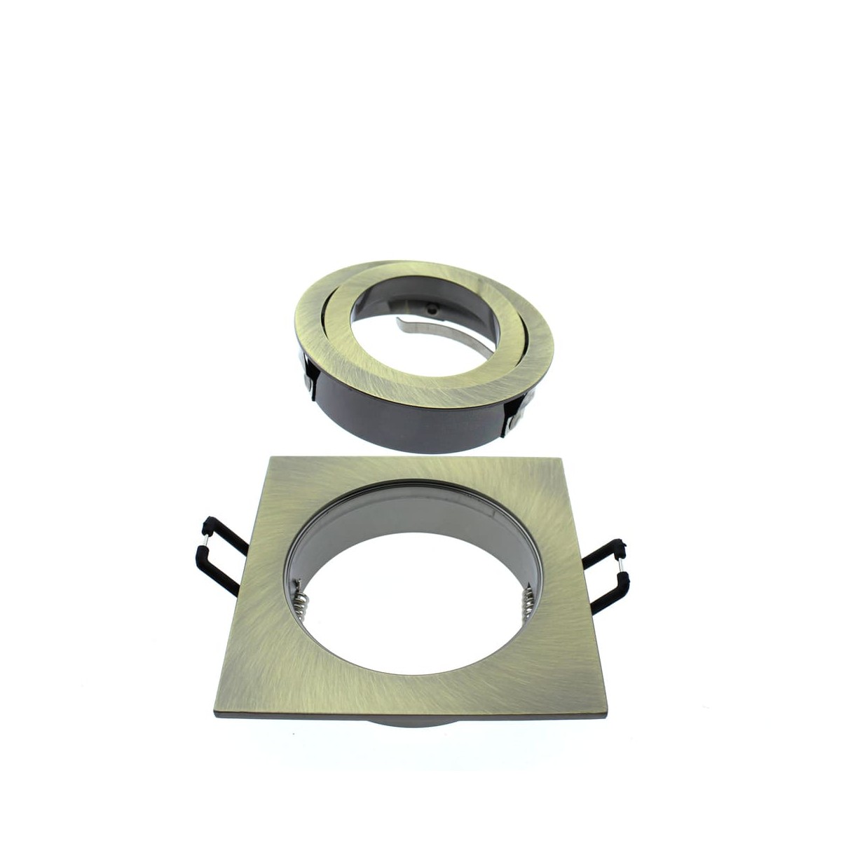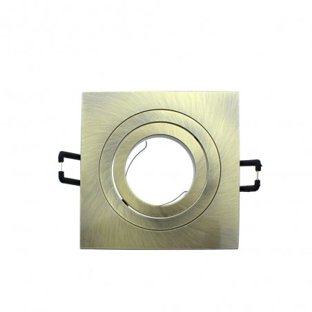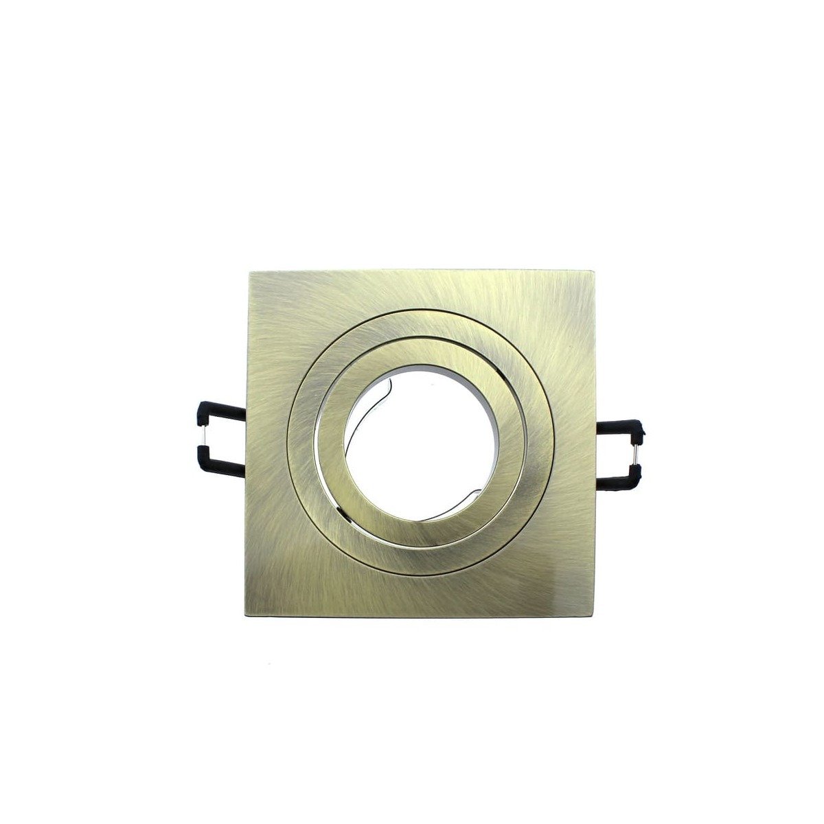 Spot carré basculant en aluminium. Ce modèle a une finition dorée antique. Il comprend un support de lampe GU10. Mesure 93 mm de chaque côté et a un diamètre de encastrement de 80 mm. Il n'est pas nécessaire de retirer le luminaire encastré pour remplacer l'ampoule, l'anneau intérieur peut être retiré pour changer l'ampoule.
