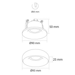 Spot encastré fixé rond adapté pour les toits bas a un encastrement de 65mm. Ce spot comprend un cercle décoratif. Comprend un support de lampe GU10. Il a une hauteur de 25 mm et un diamètre extérieur 93 mm.
