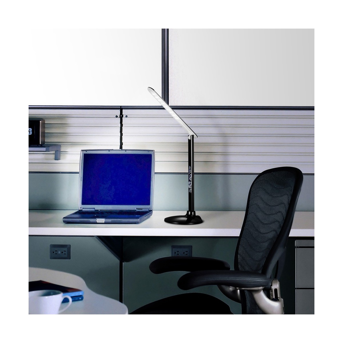 Design moderne en polycarbonate blanc. Avec port USB pour recharger le mobile. Allumage tactile et lumière LED réglable (5 intensités) avec 3 tonalités de lumière (chaud-neutre-froid). Parfait pour les tables d'étude et les bureaux. Affichage avec horloge numérique, alarme, calendrier et thermomètre. Il fonctionne avec 1 x 3V (inclus).