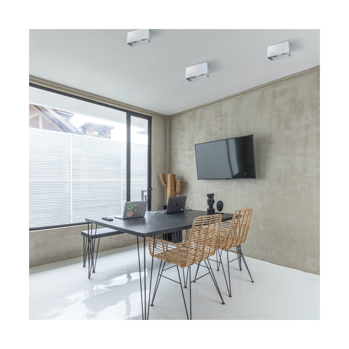 Spot de plafond avec deux lumières inclinables, pour ampoules GU10. Montage facile en surface avec remplacement de l'ampoule par l'avant. Fabriqué en aluminium avec une finition blanc mate texturée.