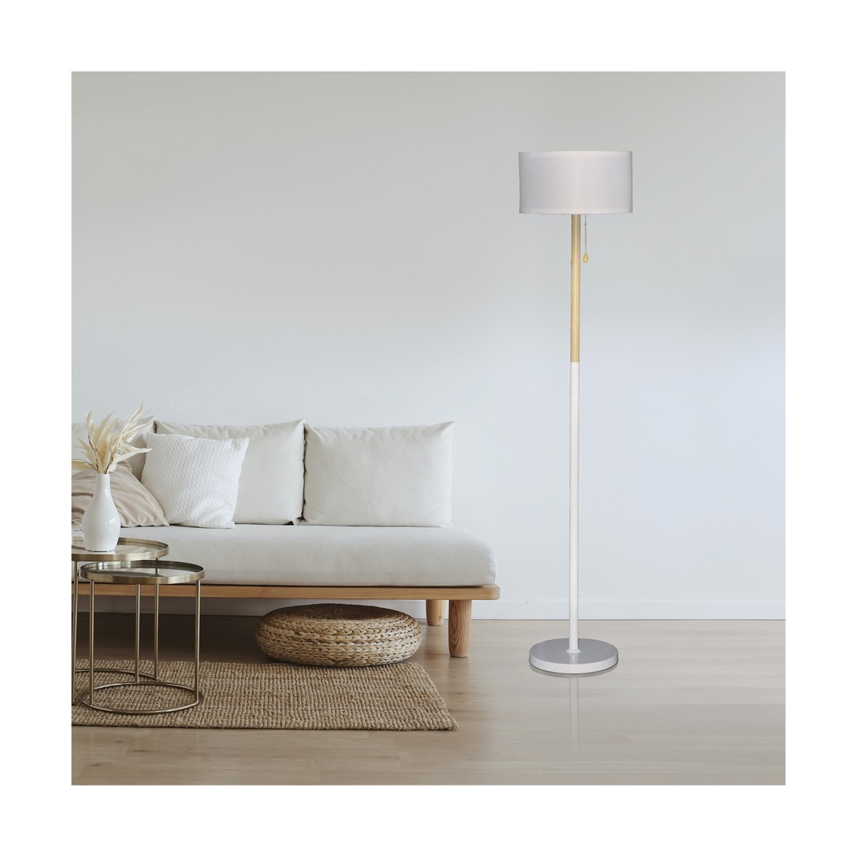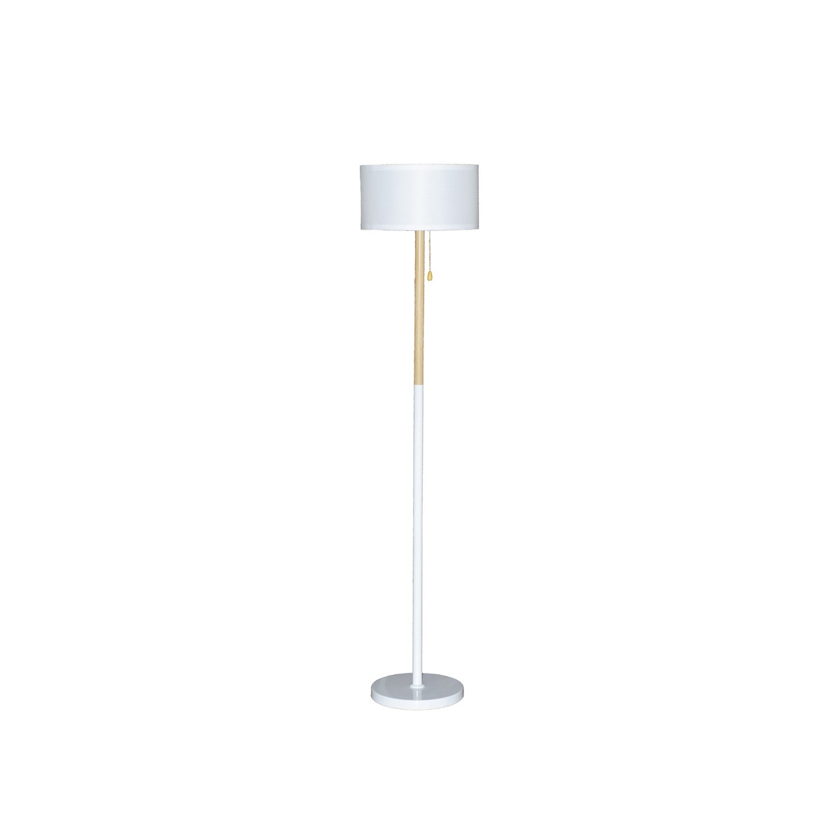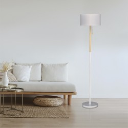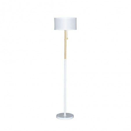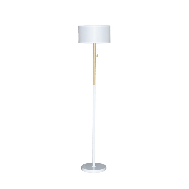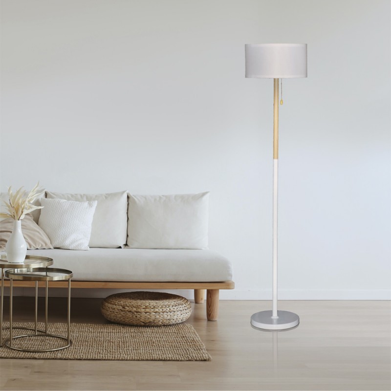 Lampadaire nordique Olivia. Lampadaire de style nordique à placer dans le salon ou la salle à manger. Structure en métal avec décoration en bois et abat-jour en tissu blanc. Parfait pour être placé à côté d'un canapé ou dans un coin de la pièce. Il dispose d'une poignée où est placée l'ampoule pour allumer et éteindre la lumière du lampadaire.